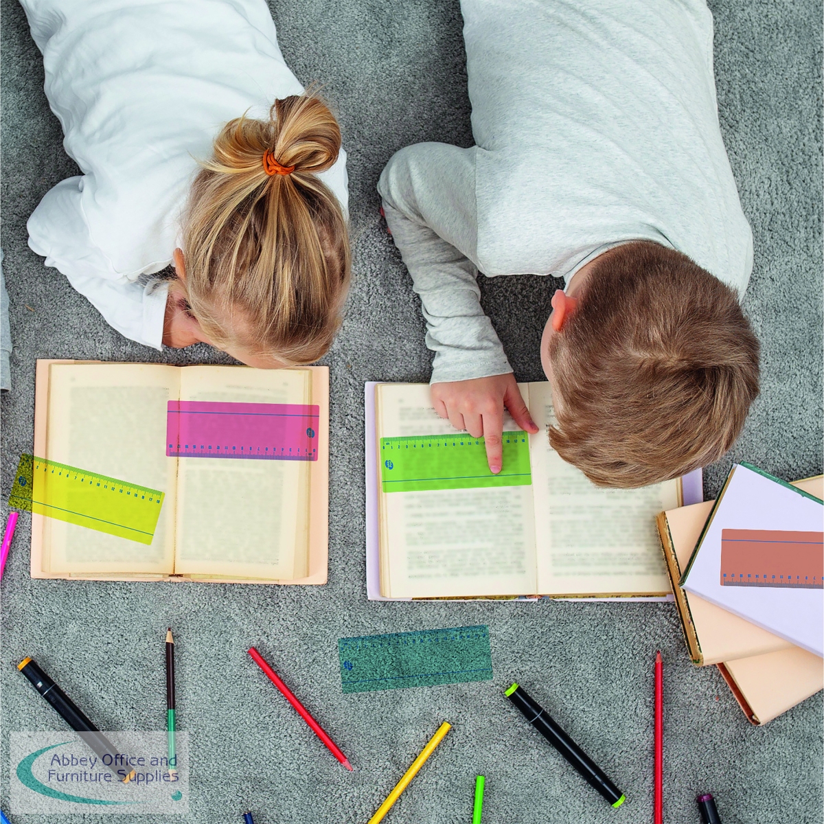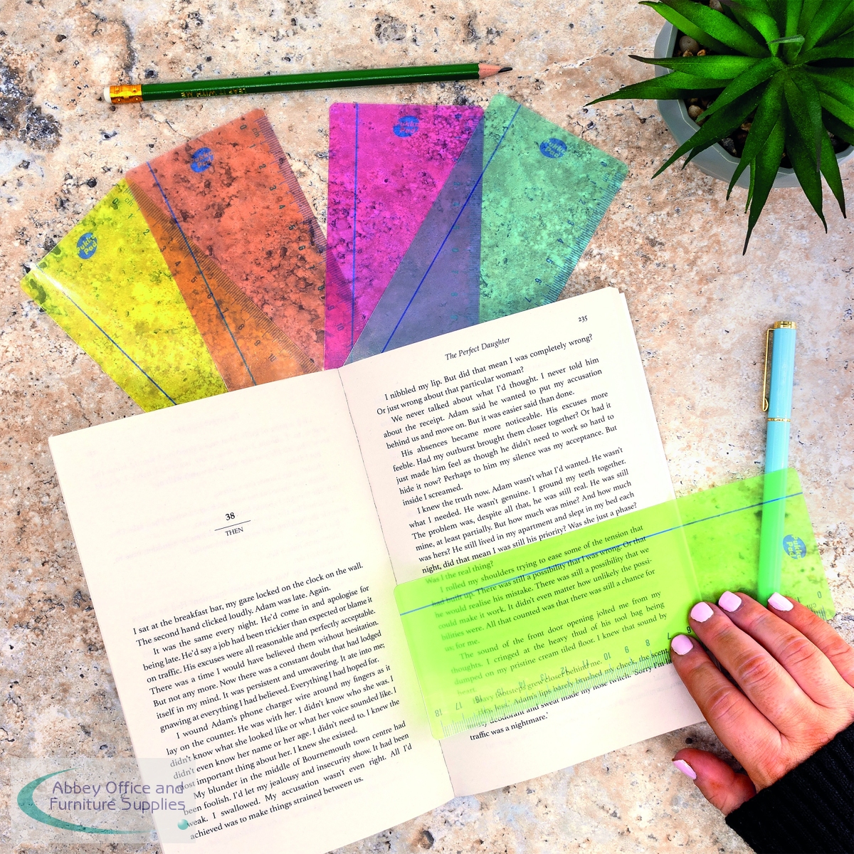 The��reading ruler helps to prevent visual stress and enhance focus whilst reading and writing. By using the reading ruler, users can minimise the symptoms associated with Irlen syndrome such as headaches, fatigue, and discomfort. The portable size, protective film and zip bag ensures the ruler stays in pristine condition and makes it an ideal companion for students moving between classes and professionals on the go. The rulers work by adjusting the colour contrast of the text, reducing visual distortions and minimising the impact of glare and light sensitivity. Colours may vary (assorted colours of: blue, green, pink, orange and yellow).