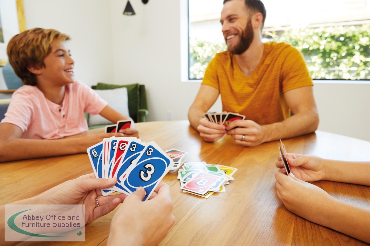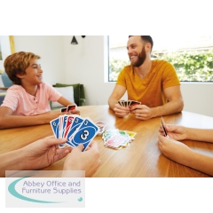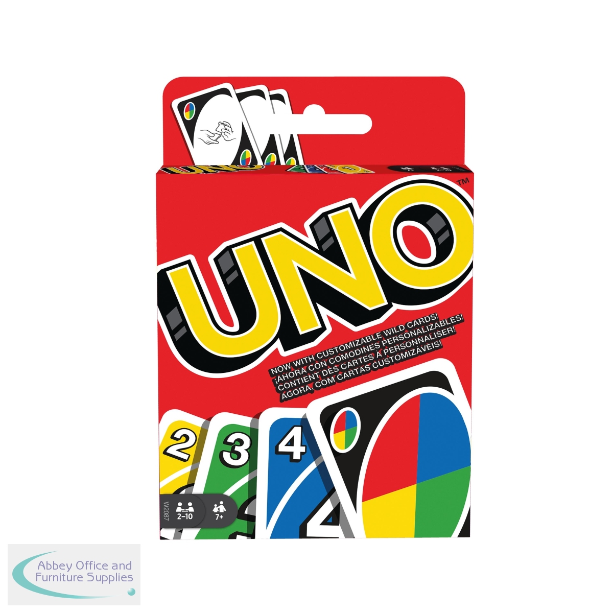 UNO, the classic card game of matching colours and numbers that is easy to pick up. Impossible to put down, now comes with customisable Wild Cards for added excitement! Players take turns racing to get rid of all their cards by matching a card in their hand with the current card shown on top of the deck. Special Action cards deliver game-changing moments and help defeat opponents! Use the Swap Hands card to change hands with any other opponent and use the 3 customisable (and erasable) Wild Cards to write your own rules! You'll find 19 cards of each colour (red, green, blue, and yellow), plus 8 Draw Two, Reverse and Skip cards in every colour, along with 4 Wild Cards, 4 Wild Draw Four cards, 1 Wild Swap Hands Card and 3 Wild Customizable cards. If you can't make a match, you must draw from the central pile! Don't forget to shout "UNO" when you only have one card remaining! The player to get rid of all the cards in their hand scores points for any cards their opponents are left holding. The first player to reach 500 points wins. Includes 112 cards and instructions. Colours and decorations may vary.