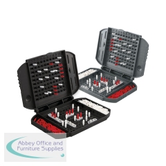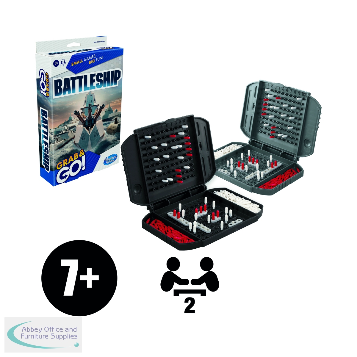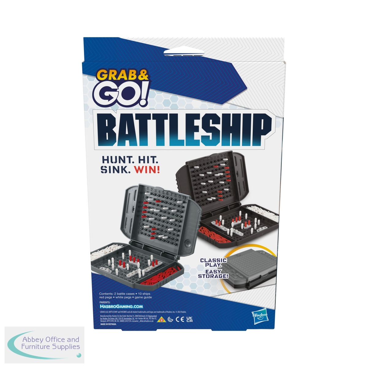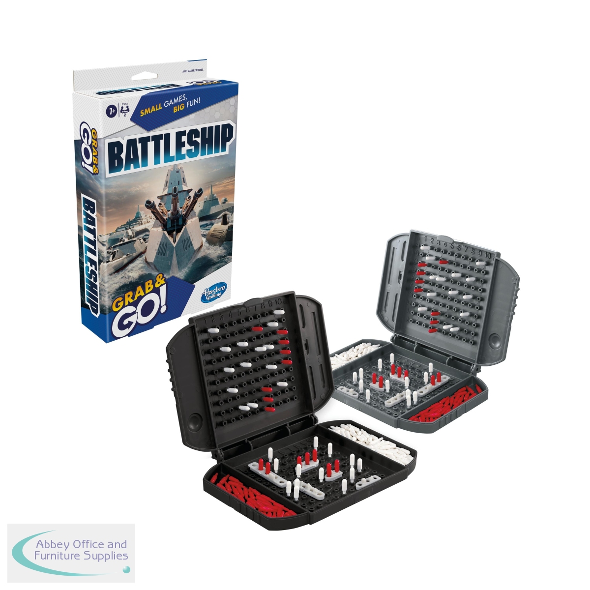 Lead your fleet to victory on the move with this compact Battleship Grab & Go game. Can you sink your opponent's ships before all of yours go down? Command your battle from the flip-open game unit and deploy your carrier, battleship, submarine, destroyer and cruiser on the grid. When the battle is over, you can store the pegs in the units and slide them together for easy storage. You'll rule the oceans when you Grab & Go with Battleship!