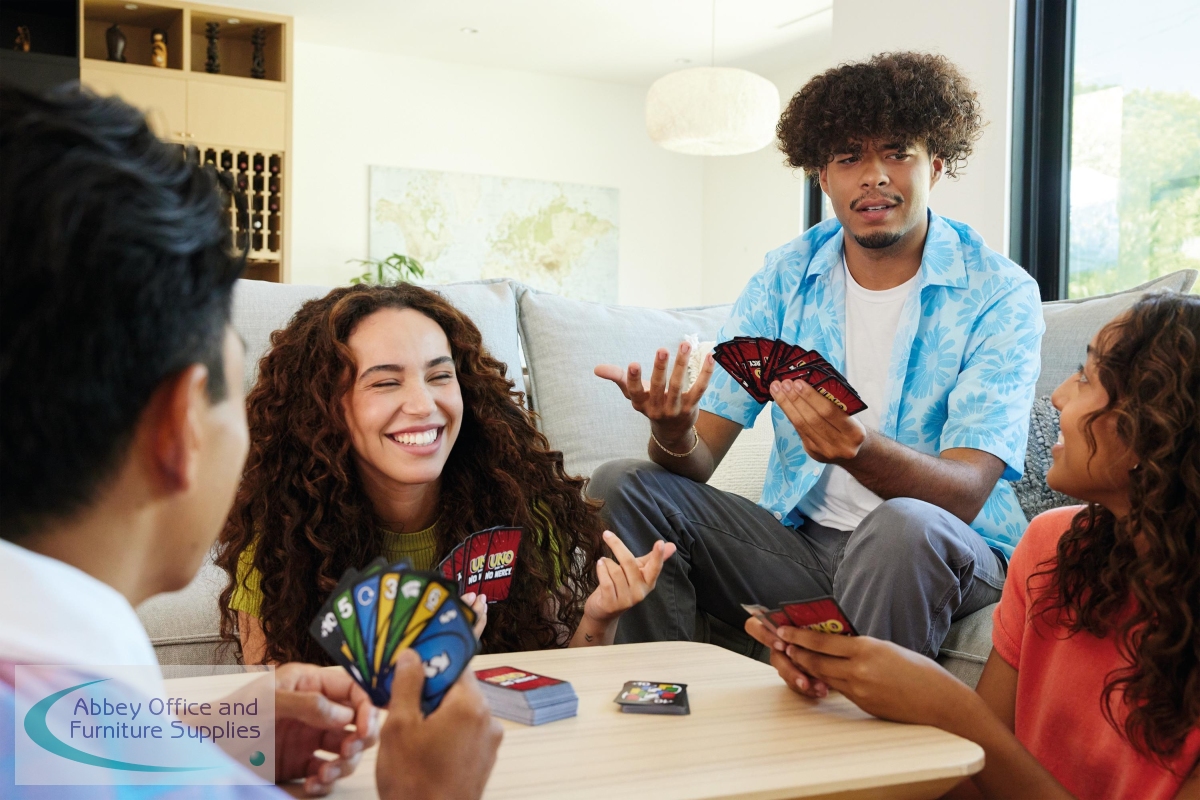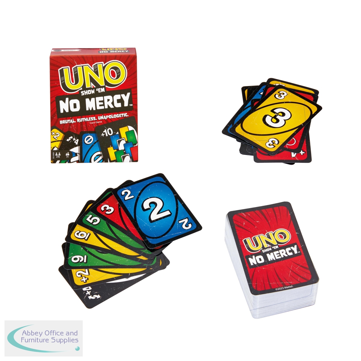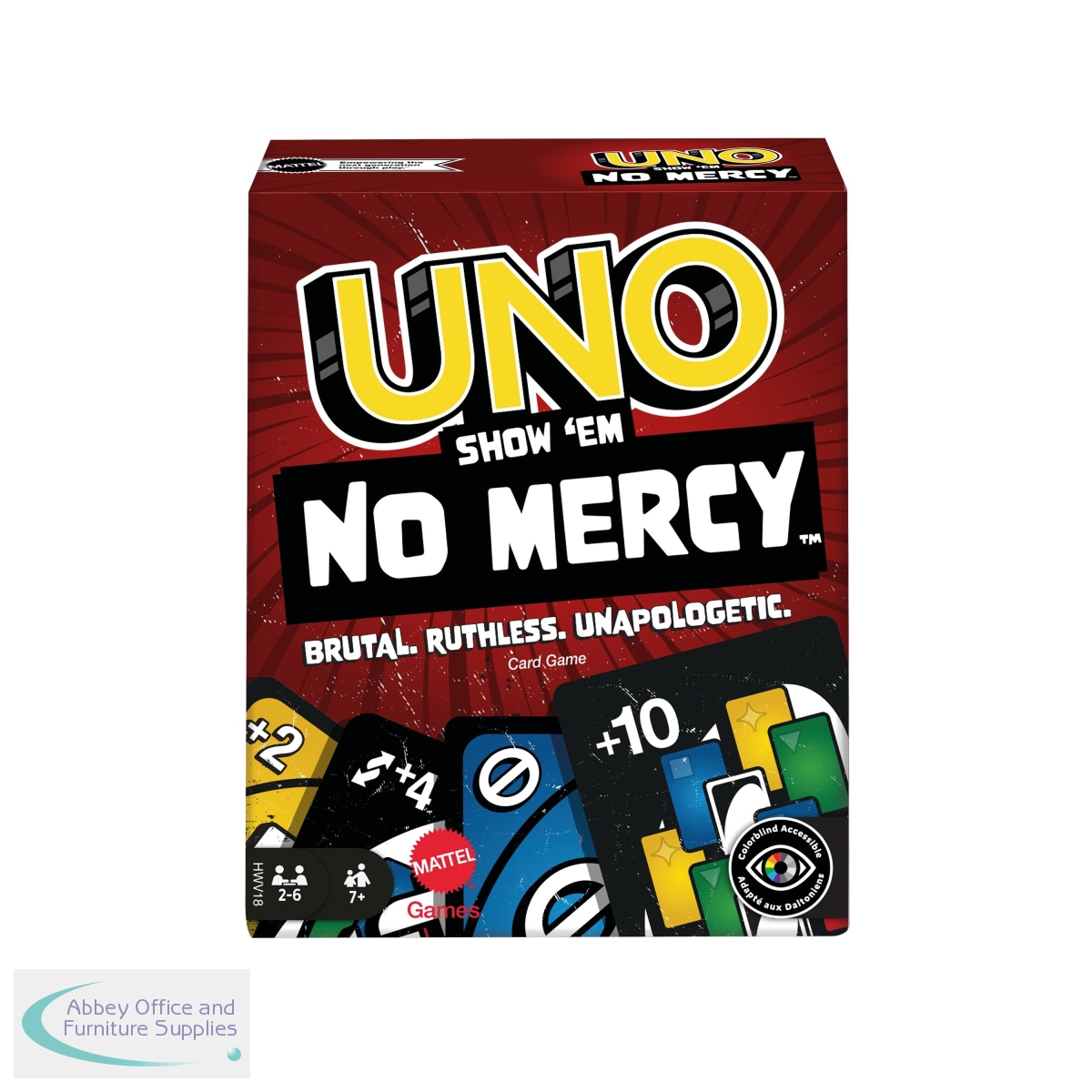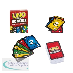 UNO Show Em No Mercy is a brutal, ruthless version of the classic UNO card game. In addition to standard action cards like Skip, Reverse, and Draw 2, No Mercy comes with Wild Draw 6, Wild Draw 10, Skip Everyone, Discard All, and the new Wild Colour Roulette - a card that forces the next player to choose a color and then draw until they get a card of that color. In addition to new action cards, many popular house rules have been included in the actual rules. Stacking is legal. 7s swap and 0s pass hands. And when you can't play a card, you must draw until you can play. But the biggest change in UNO Show Em No Mercy is the Mercy Rule. If you ever have 25 or more cards in your hand, you get kicked out of the game.