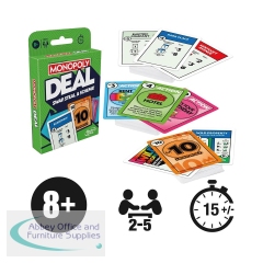 Swap, steal, and scheme with the Monopoly Deal card game! Be the first player to collect 3 complete Property card sets, each in a different colour, to win. This deck includes 110 cards: Property cards, Wild Property cards, Action cards, and Money cards. Wild Property cards help players build Property sets. Action cards mix up the game by letting players collect rent, steal and swap properties, and more. Players pay their debts with Money cards. Easy to play and set up, this card game for ages 8 and up can be played in as little as 15 minutes! Whether you're searching for fun games for kids and adults, family games, or kids travel games, it's a great pick for anytime play.
