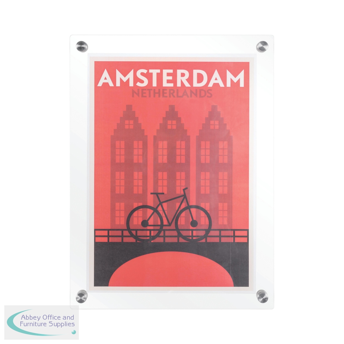 The Bi-Office River Acrylic Poster Display is perfect for displaying a wide range of items. From art and photos to company's certificates or health and safety signs, important documents can be stylishly displayed in hotel corridors, office meeting rooms, etc. Your poster is sandwiched between two acrylic panels. To update the poster print, simply remove it and slide in the new one. The acrylic is as clear as glass but much safer since it doesn't shatter. Plus, it's easy to clean and disinfect. Polished edges and rounded corners for increased user safety. Wall mount it with 4-corner pass-through metal fixations in a portrait or landscape position. Supplied with the necessary instructions and installation kit, is very easy to wall mount.