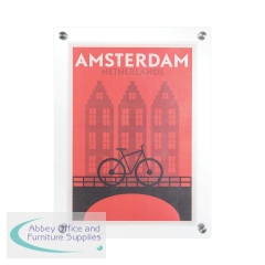 The Bi-Office River Acrylic Poster Display is perfect for displaying a wide range of items. From art and photos to company's certificates or health and safety signs, important documents can be stylishly displayed in hotel corridors, office meeting rooms, etc. Your poster is sandwiched between two acrylic panels. To update the poster print, simply remove it and slide in the new one. The acrylic is as clear as glass but much safer since it doesn't shatter. Plus, it's easy to clean and disinfect. Polished edges and rounded corners for increased user safety. Wall mount it with 4-corner pass-through metal fixations in a portrait or landscape position. Supplied with the necessary instructions and installation kit, is very easy to wall mount.