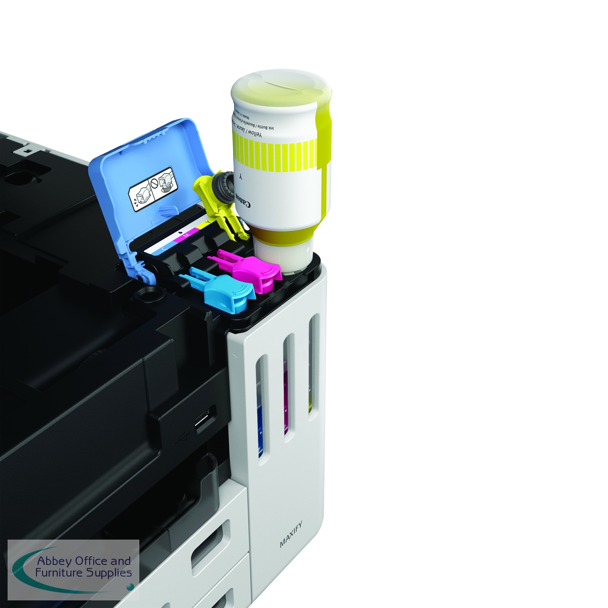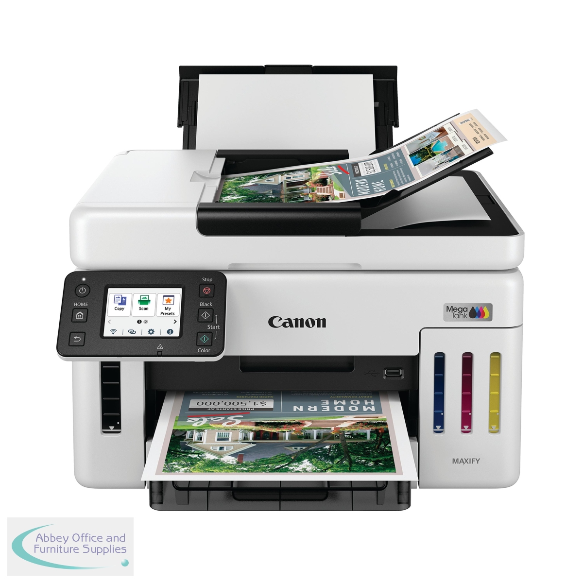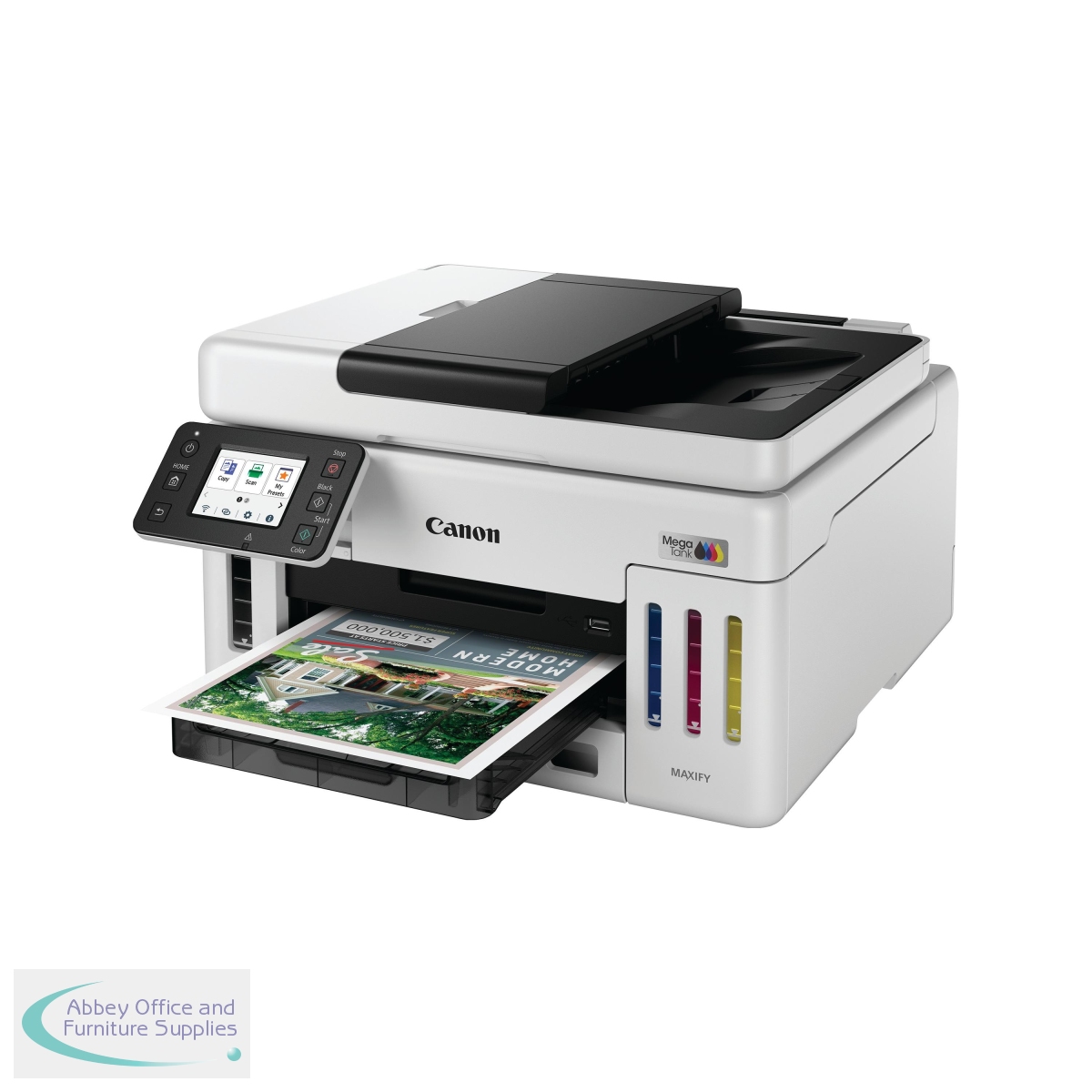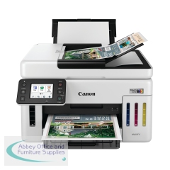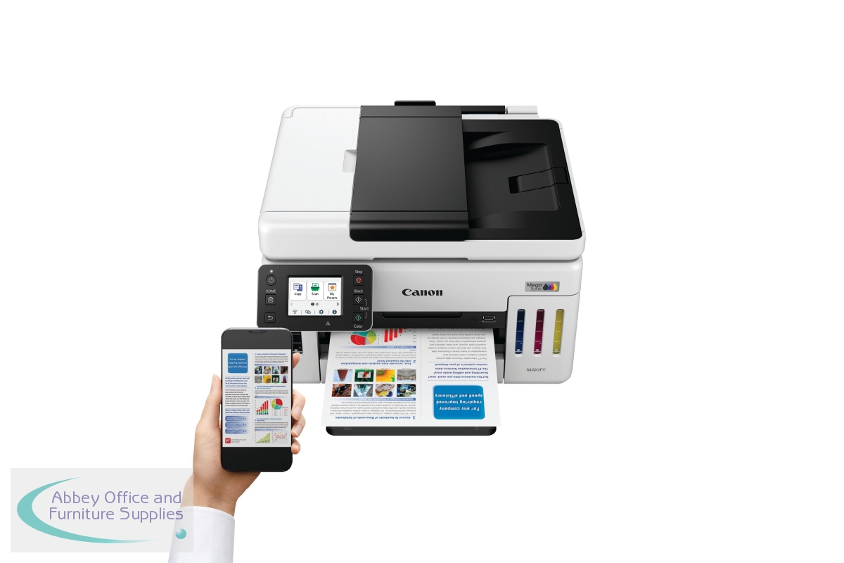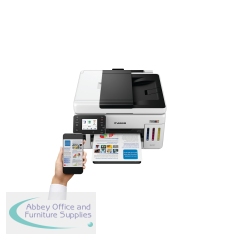Save on total printing costs with the small-office workhorse Canon MAXIFY GX6150 3-in-1 Refillable MegaTank Inkjet Printer. With a 14,000 page yield from a set of colour ink bottles or up to 6,000 page yield from a black ink bottle, you are guaranteed to keep business costs low during high-volume everyday printing. Small in size but packed in features, the printer includes 350-sheet paper capacity, 50-sheet ADF and print speeds of up to 24 ipm. Print, scan, copy and connect to Cloud, handle diverse media and enjoy multi-level security, all using the user-friendly 6.9cm tiltable LCD colour touchscreen. The printer will fit into your businesses workflow, and you can connect to the Canon PRINT App, Apple AirPrint (iOS) and Mopria (Android) to enable round-the-clock 24-hour printing from any location.