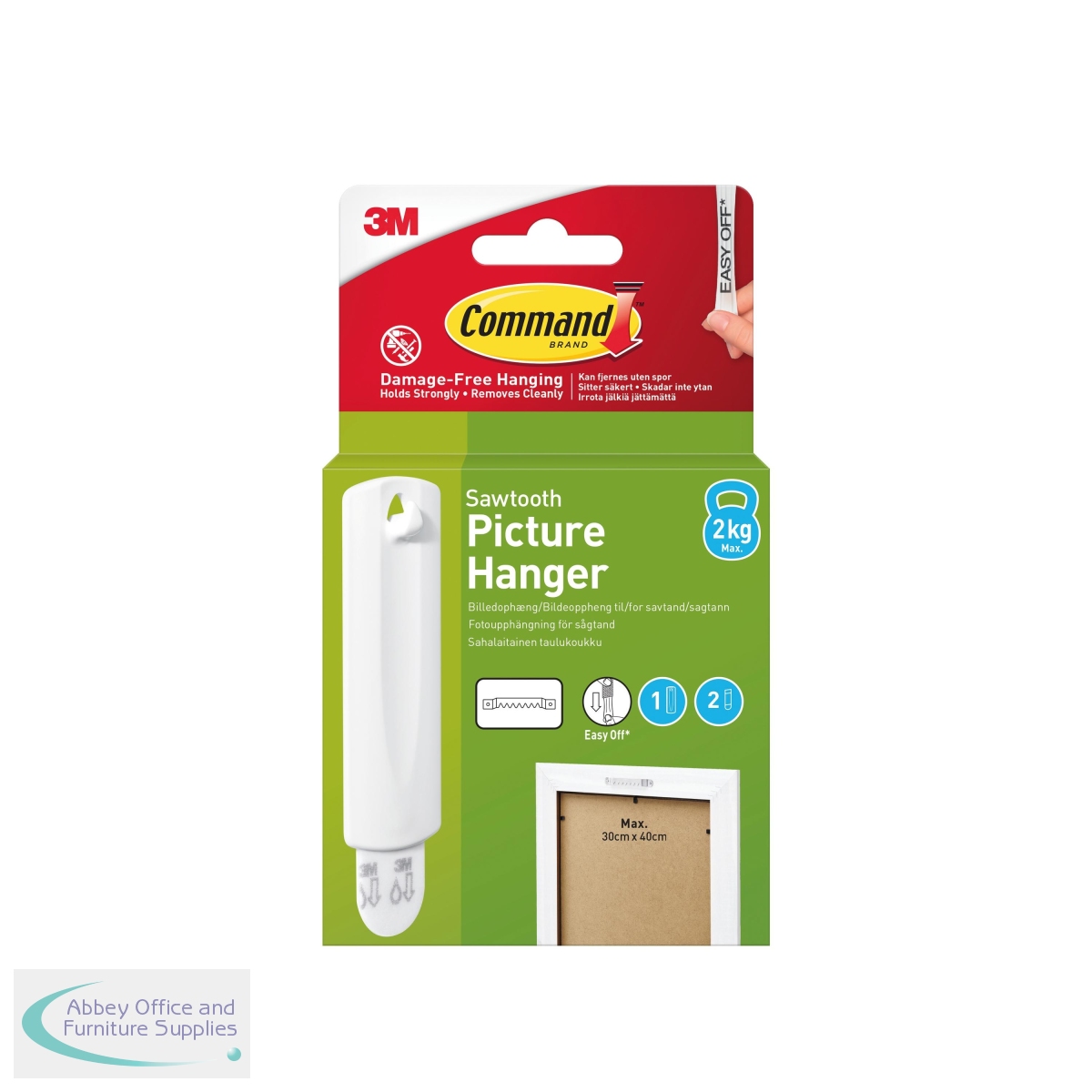 For use at home or in the office, this Command Sawtooth Picture Hanger is an innovative solution for hanging pictures securely and damage free. Holding strongly and removing cleanly using 3M stretch release technology, without the need for nails or tools of any kind, these sawtooth hangers hold up to 2kg. This pack contains 1 hook and 2 strips in white.