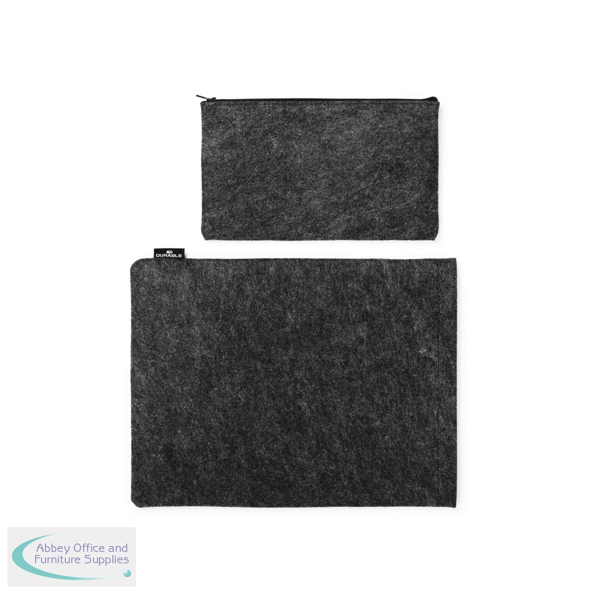 Introducing Durable's sleek protective laptop sleeve made from 60% recycled felt. It offers durable protection for tablets or laptops up to 13 inches. Lightweight and portable, it's perfect for everyday use, easily fitting into a backpack, briefcase, or handbag. The sleeve features high-quality fasteners to safeguard against scratches and damage, while the included accessory bag provides extra storage. Loops and press studs securely connect the two, but they can also be used separately for added versatility.