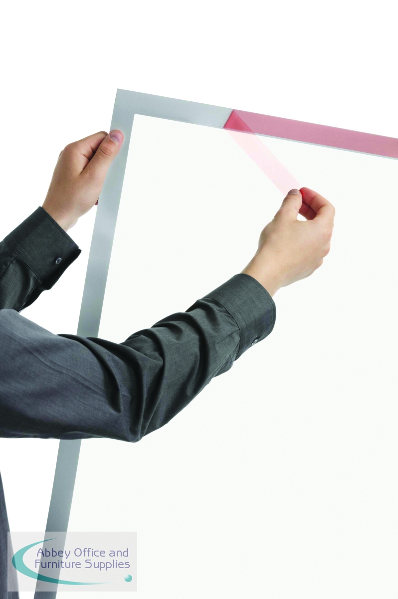 The original fold-back frame. Duraframe Poster is heat stable up to approximately 70 degrees, UV resistant and anti-glare. The frames are double-sided, so when applied to glass, different information can be displayed on either side. They are suitable for posters on walls, glass and shop windows etc. Quick insertion and exchange of documents via a fold-back magnetic frame helps with quick-changing, seasonal signage. Bubble-free attachment thanks to two adhesive strips on the back, to give a professional look. The frames can be removed without leaving any residue and can be used in portrait and landscape orientations.