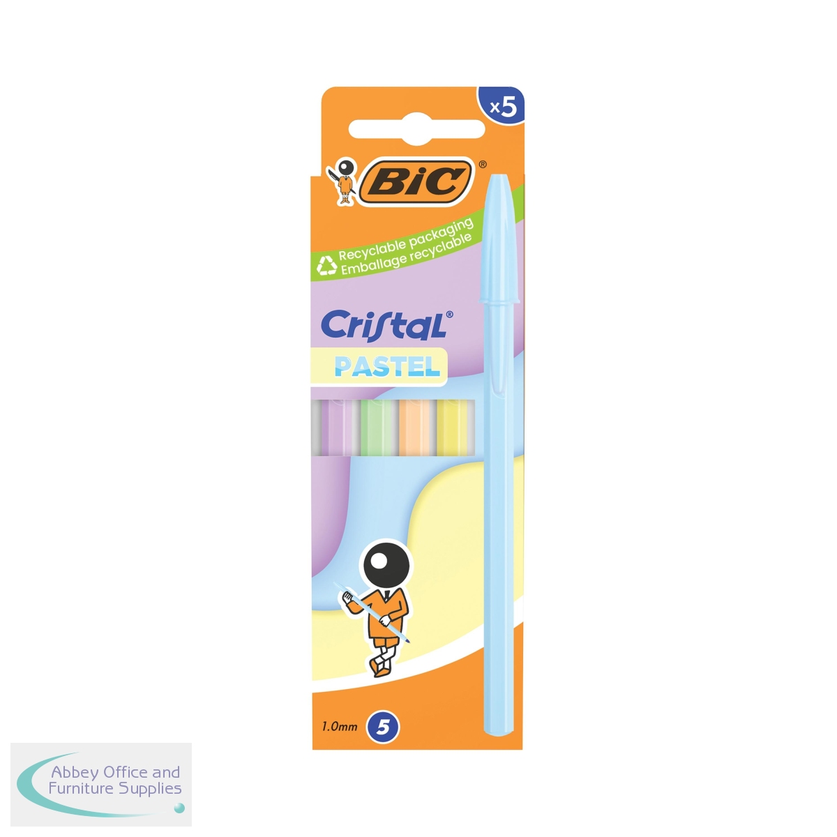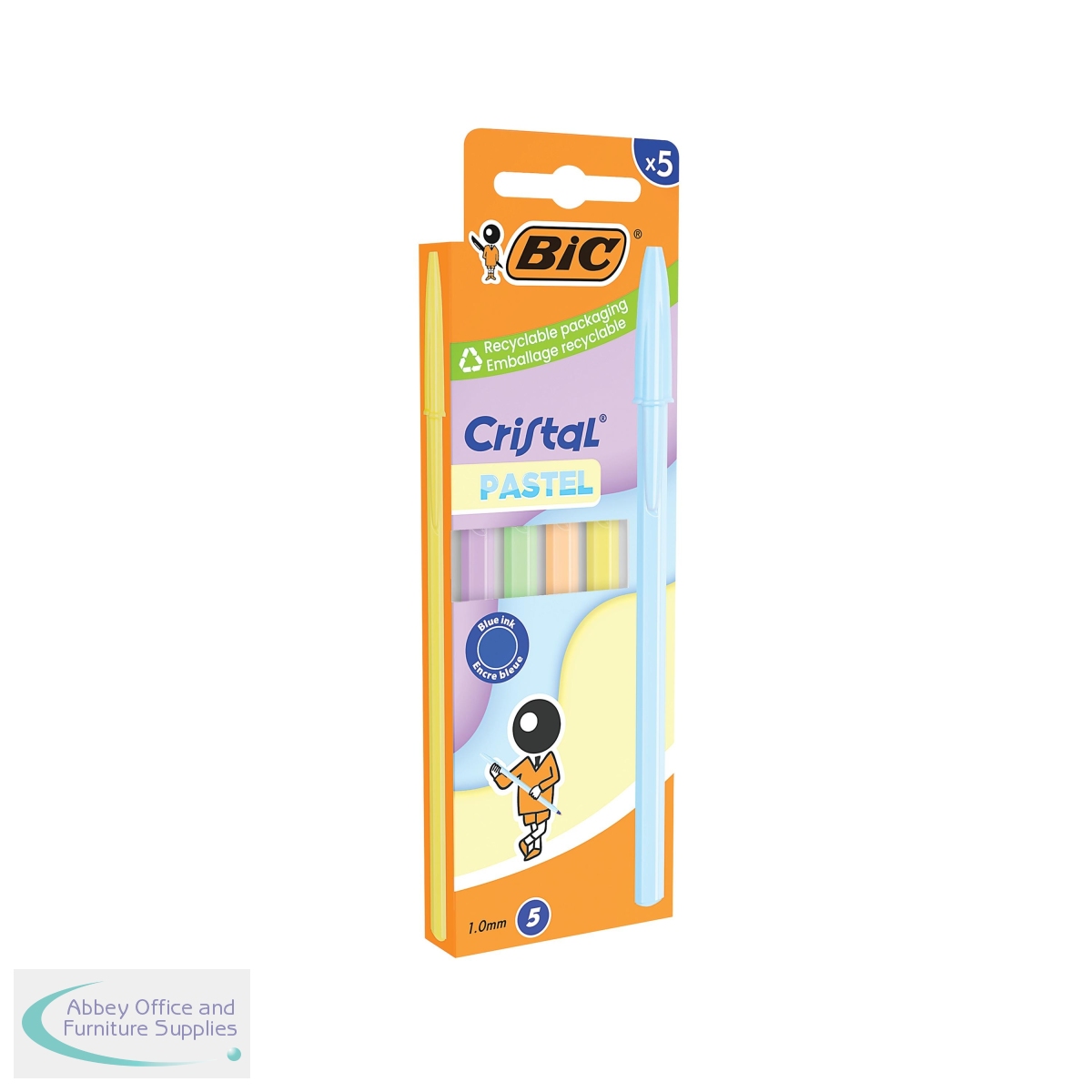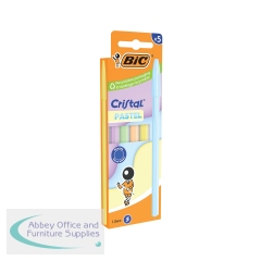 The BIC Cristal Pastel ballpoint pen brightens up any pencil case. This box of 5 contains matching barrels and caps in 5 different trendy pastel hues. Featuring a medium 1.00mm tip that writes 0.32mm lines in blue ink. The calibrated ink delivery system provides even flow and reliable long-lasting writing. With a hexagonal barrel for the comfort and control, these pens make writing clean, neat and more cheerful with the all-pastel barrels of the latest version of the BIC Cristal pen.