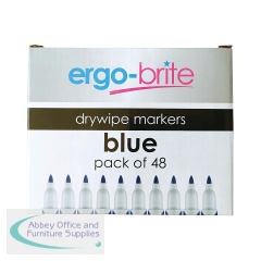 These Drywipe marker pens with a bullet tip give consistent bold lines. Featuring a rubber grip for comfort, the marker pens are suitable for use on dry wipe boards. Supplied in a pack of 48 blue drywipe marker pens.