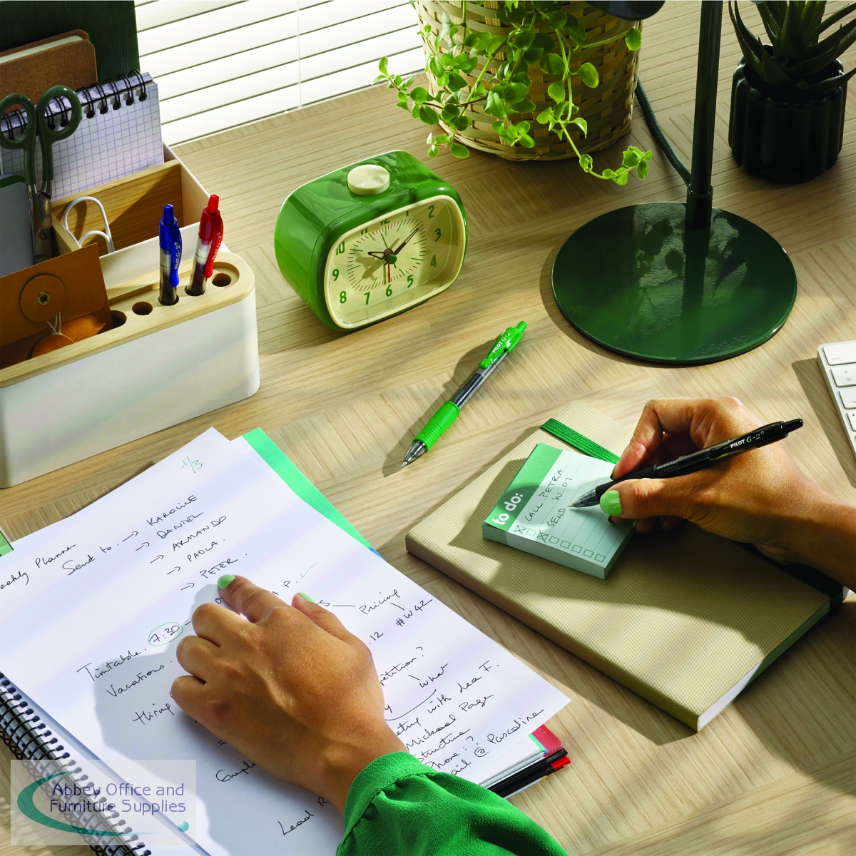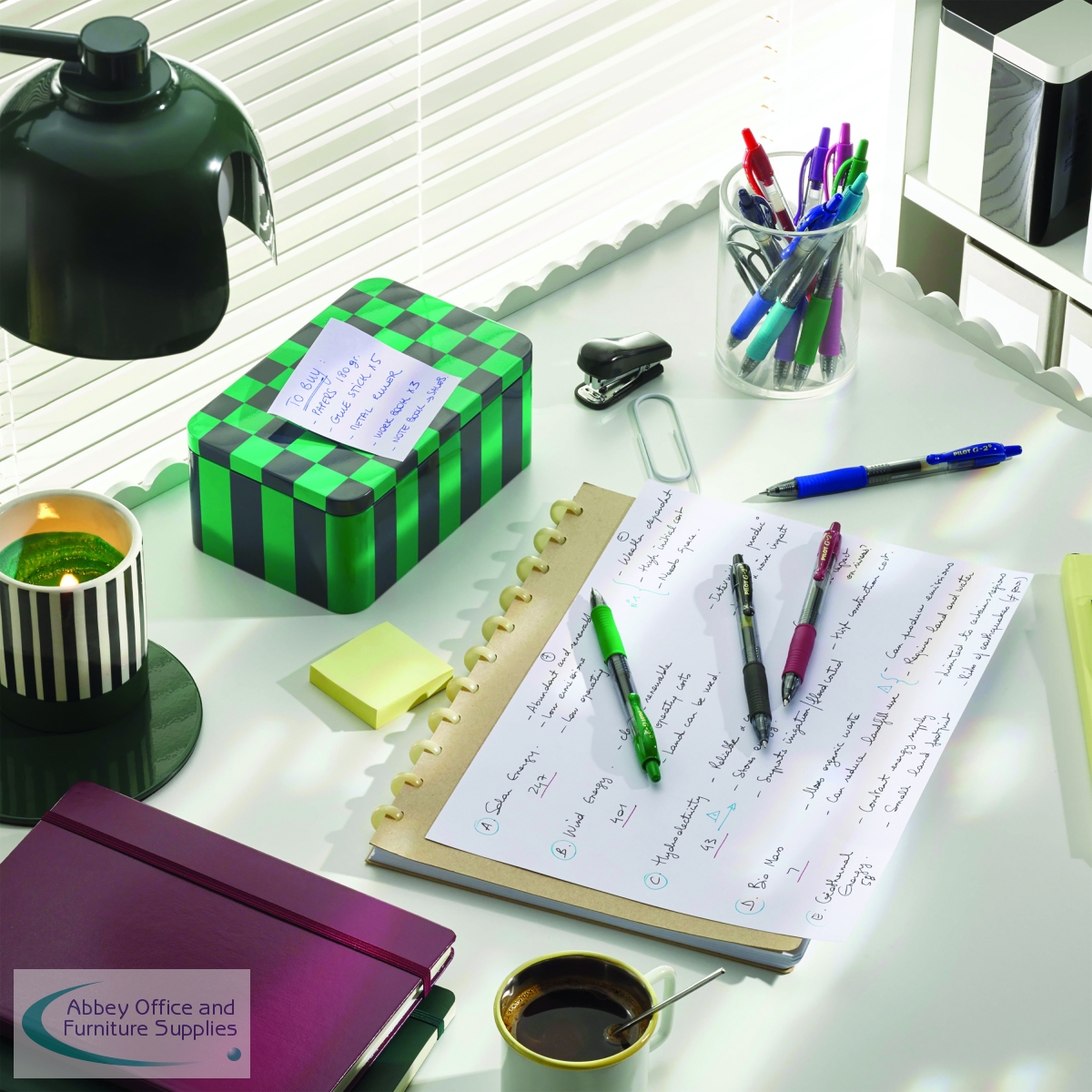 The iconic and best-selling retractable gel pen from Pilot. Now part of Pilot Be Green Range with 75% recycled plastic. Favoured worldwide by professionals and the public alike, the smooth gel ink provides a blob-free and vivid writing experience from start to finish. The longest writing length in the Gel market with over 997m writing length. With over thirty exciting colours to choose from, there's a G207 for every occasion, and with refills available this is truly a pen that will stay with you for years. The cushioned ergonomic grip and smooth curves of the pocket clip give the pen a simple yet elegant finish that fits in the pocket, pencil case or hand with equal ease, letting you simply write. The black, blue, red and green colours are now made from 75% recycled plastic, are CO2 compensated and refillable. 0.7mm tip gives a 0.39mm medium line.