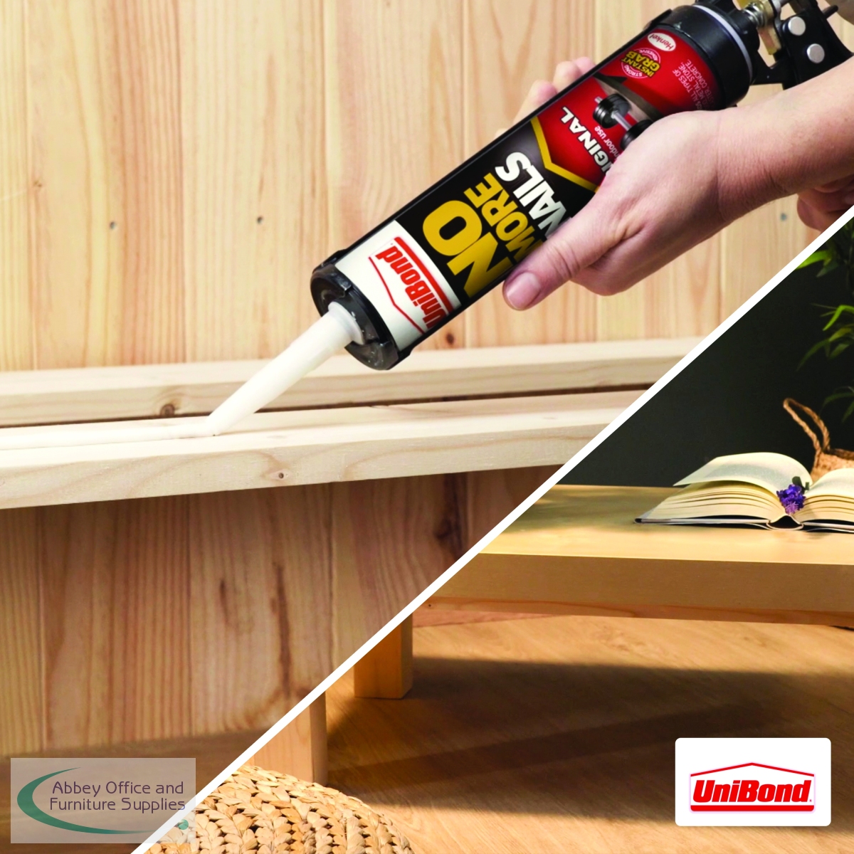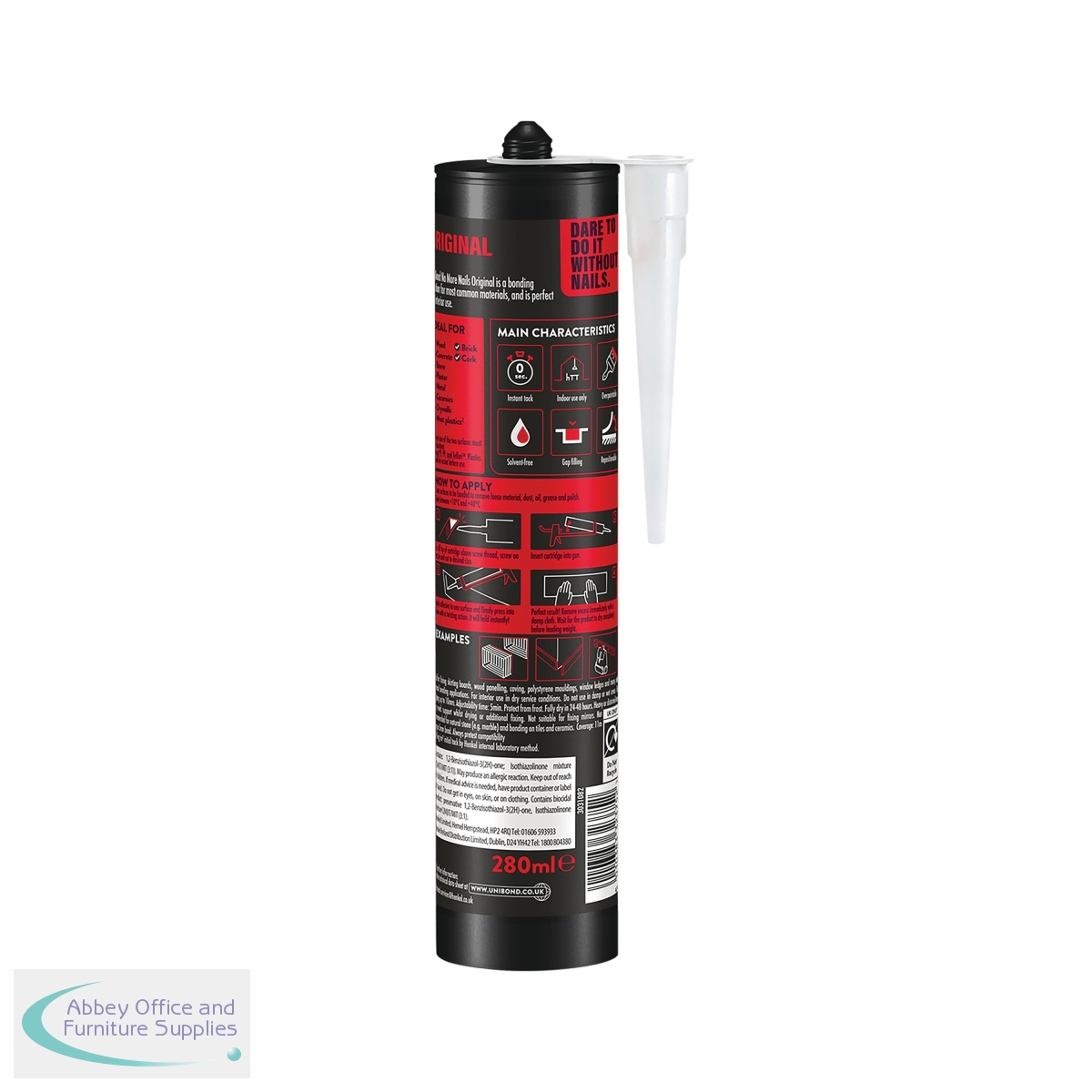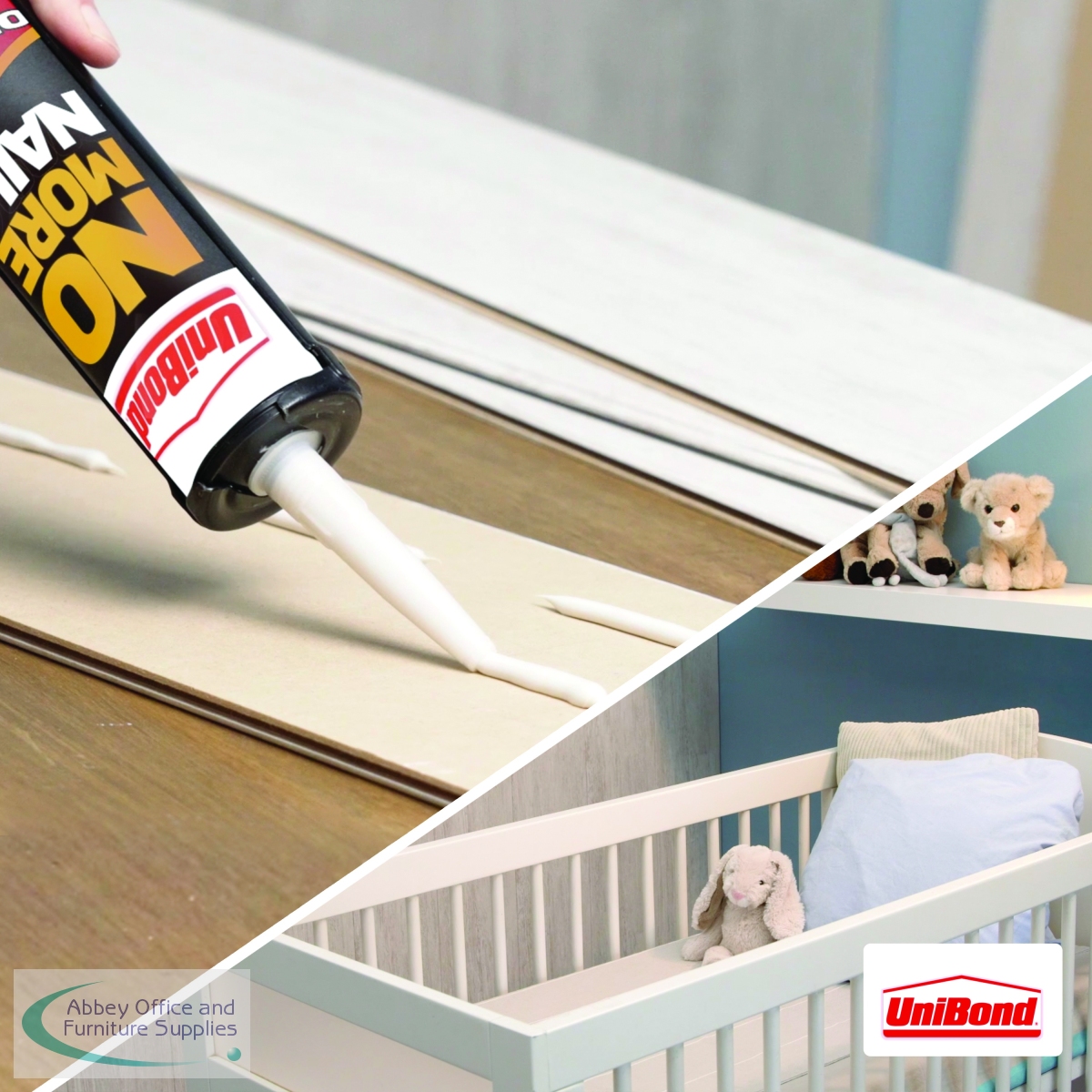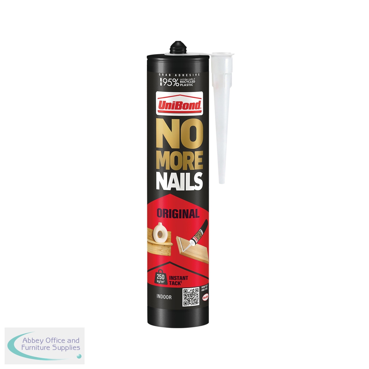 UniBond No More Nails Original is an extremely strong adhesive providing instant grab. Eliminating the need for nails and screws in DIY and repair work at home or in the office, the adhesive is ideal for mounting and bonding common building materials. Suitable for surfaces that are absorbent and supports up to 250 kg/m. Supplied in a 280ml tube.
