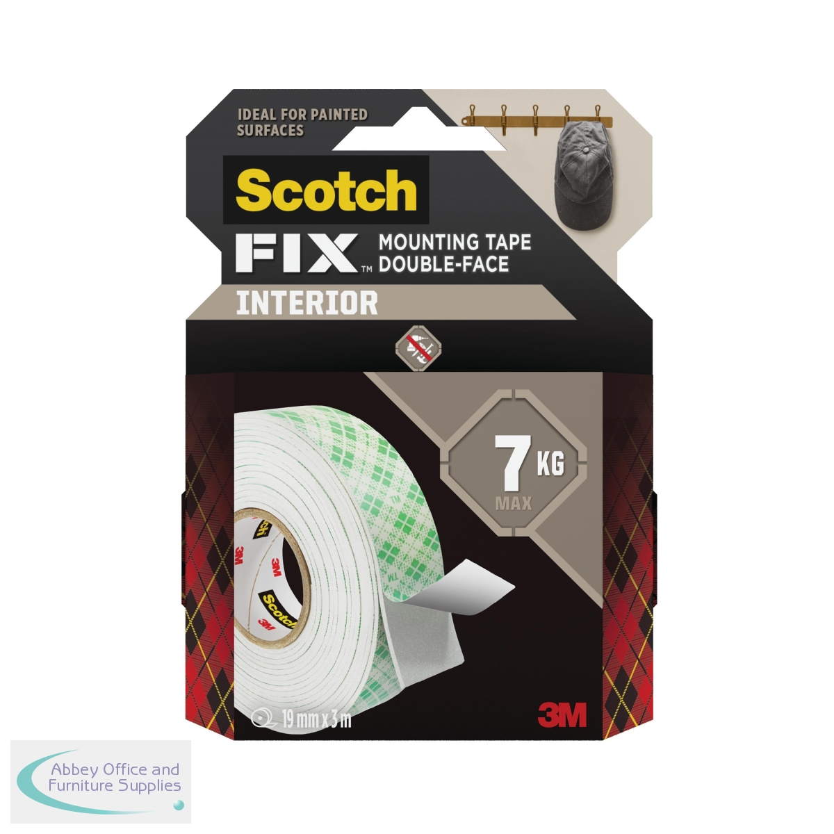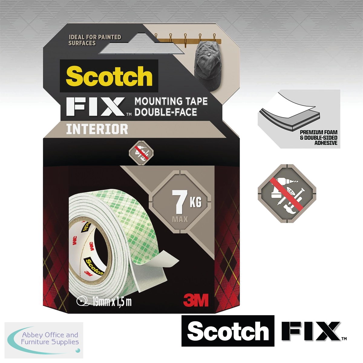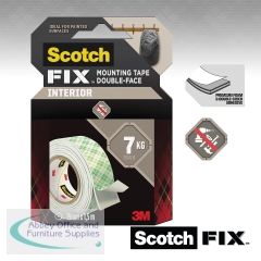 Scotch-FIX interior mounting tape is a foam tape intended for indoor use and is ideal on painted drywall, finished wood, metal, acrylic, tile and glass. Measuring 19mm x 3m, this roll of double sided mounting tape in white holds up to 7kg, making it ideal for indoor repairing or mounting such as a kitchen roll holder, chalkboards, keyring holder, desk organisers and more.