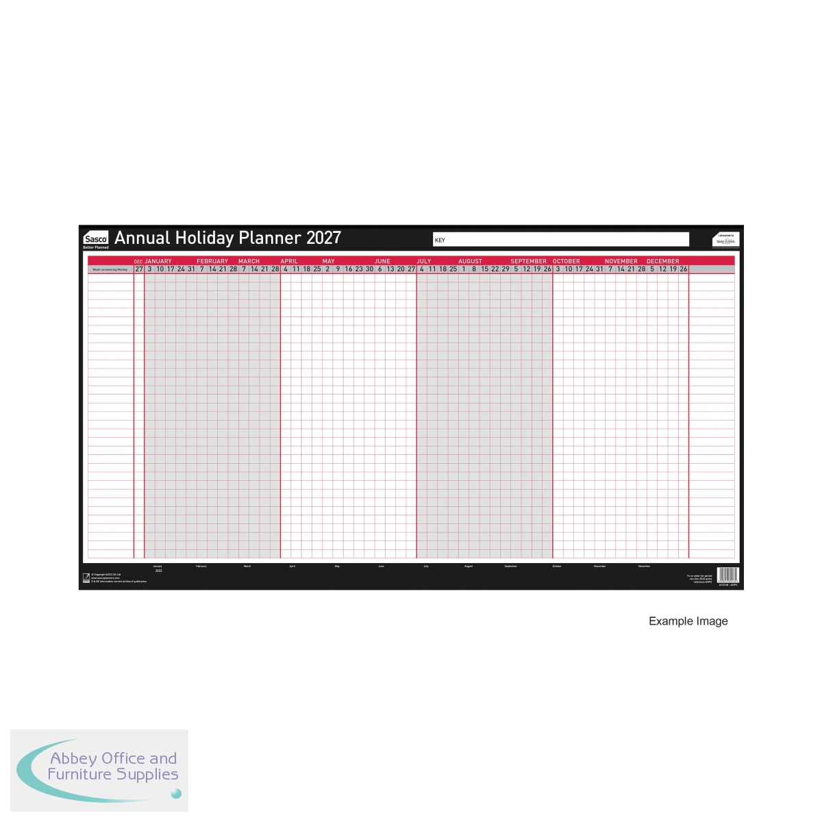 Track your staff annual leave entitlement and keep holidays coordinated using this annual holiday planner from Sasco. The planner displays weekly columns using Monday start dates with space for the holidays of up to 33 members of staff to be recorded. Easily track reserved annual leave within a workplace and check instantly if the maximum quota has been reached for a certain week. The laminated surface allows you to wipe off and change recordings. This planner measures 750 x 410mm.