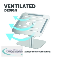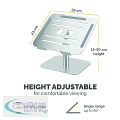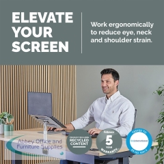 The Fellowes Alumia Desk Based Laptop Stand is designed to help minimise discomfort in your workspace by elevating your laptop to a more ergonomically correct viewing position, reducing neck and eye strain. It supports laptops up to 5kg in weight and screen sizes up to 15 inches. With up to 15cm of easy height adjustments (15-30cm) it promotes good posture and all-day comfort. The compact design makes it perfect for small workspaces. The platform is tilt adjustable allowing you to optimise your screen positioning, ideal for restricted opening laptops/MacBooks, while the open design enhances air circulation to help keep your device cool.