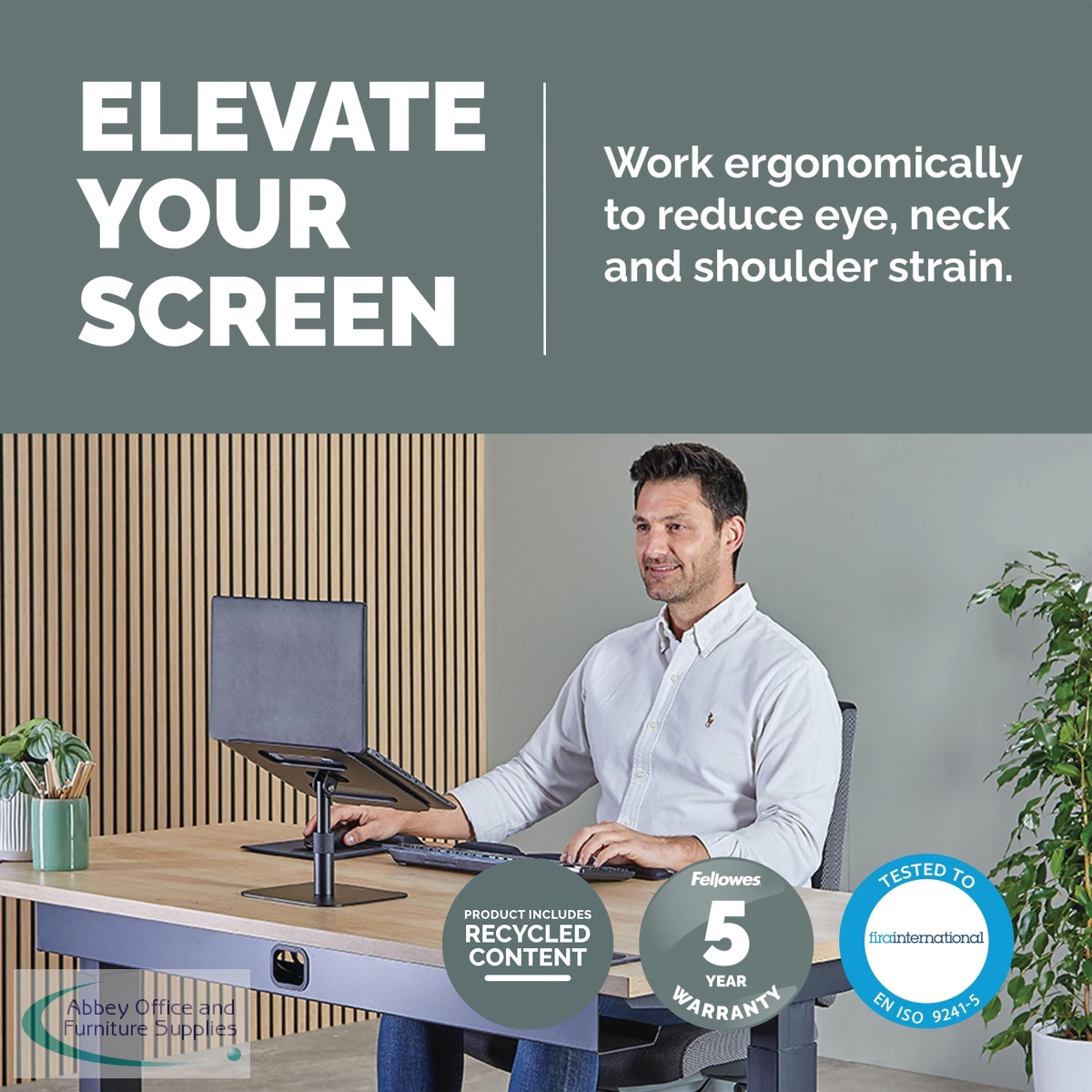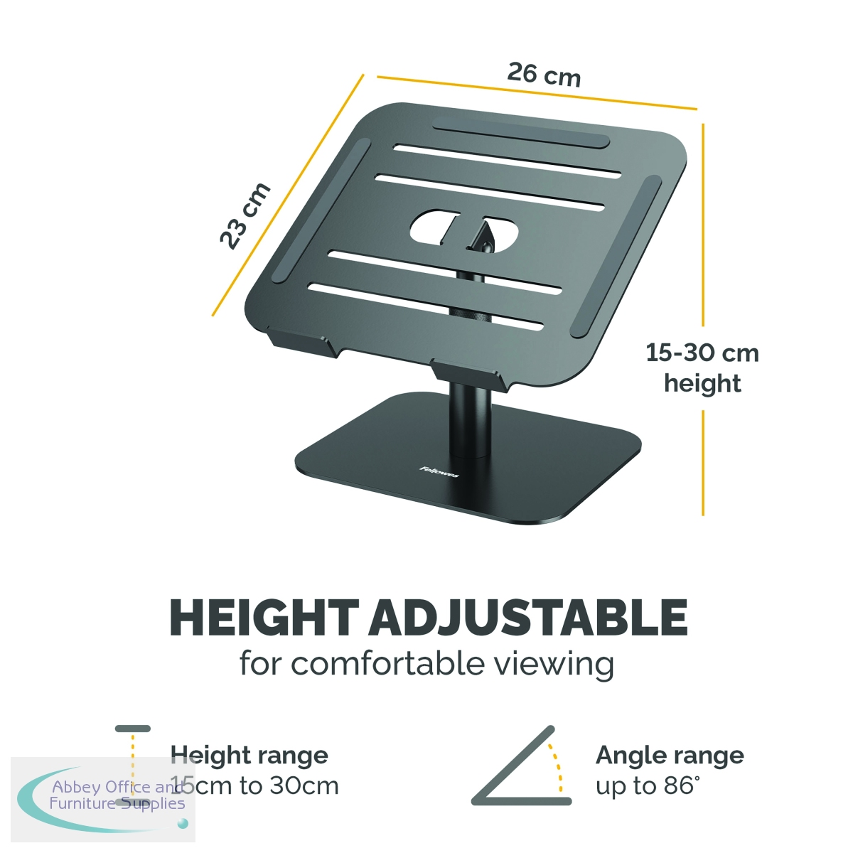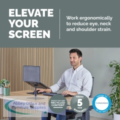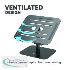 The Fellowes Alumia Desk Based Laptop Stand is designed to help minimise discomfort in your workspace by elevating your laptop to a more ergonomically correct viewing position, reducing neck and eye strain. It supports laptops up to 5kg in weight and screen sizes up to 15 inches. With up to 15cm of easy height adjustments (15-30cm) it promotes good posture and all-day comfort. The compact design makes it perfect for small workspaces. The platform is tilt adjustable allowing you to optimise your screen positioning, ideal for restricted opening laptops/MacBooks, while the open design enhances air circulation to help keep your device cool.