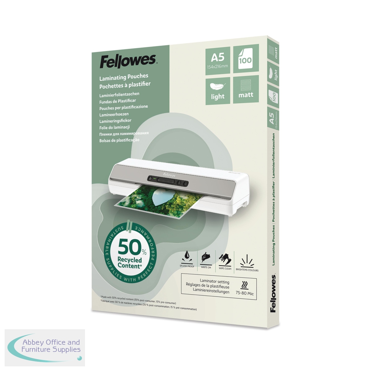 BB81384 - Fellowes Recycled A5 Laminating Pouches Matt 80 Micron (Pack of 100) 100143437