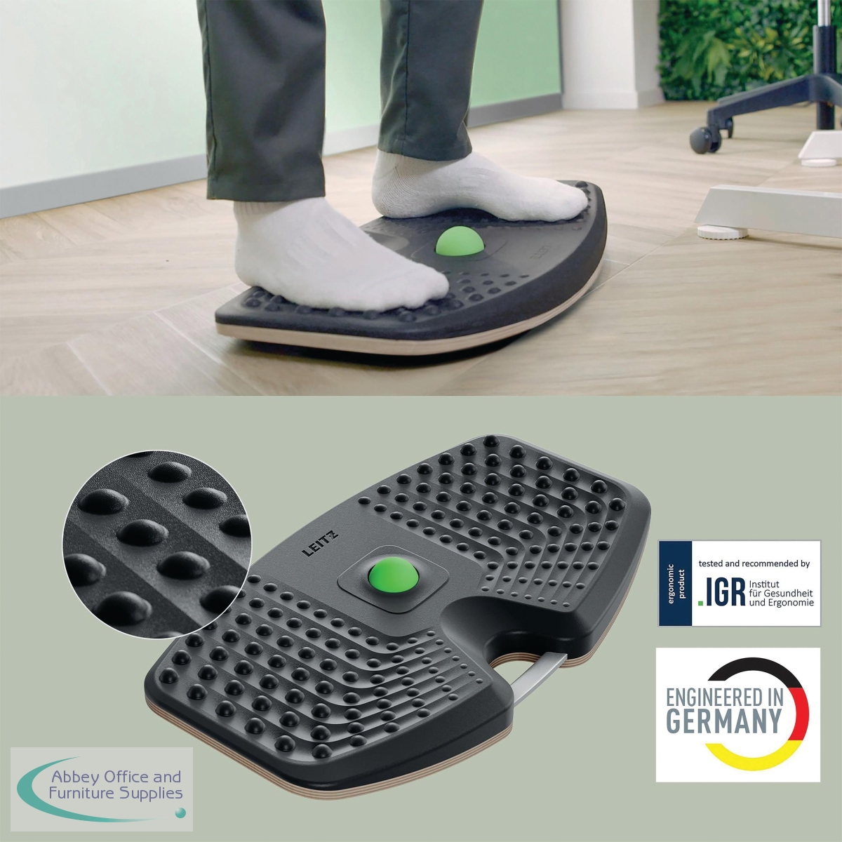The Leitz Ergo Active Balance Board is designed to help strengthen your core, improve posture, reduce fatigue and boost energy whilst keeping legs and core muscles moving. The anti fatigue textured massage surface can reduce pressure on joints and muscles and increase blood flow which helps boost energy levels and keep you more alert and focused. The board features a premium strong and soft foam surface for optimal grip suitable for shoes, socks or barefoot with a water-resistant surface that protects against spills and can be effortlessly wiped clean.