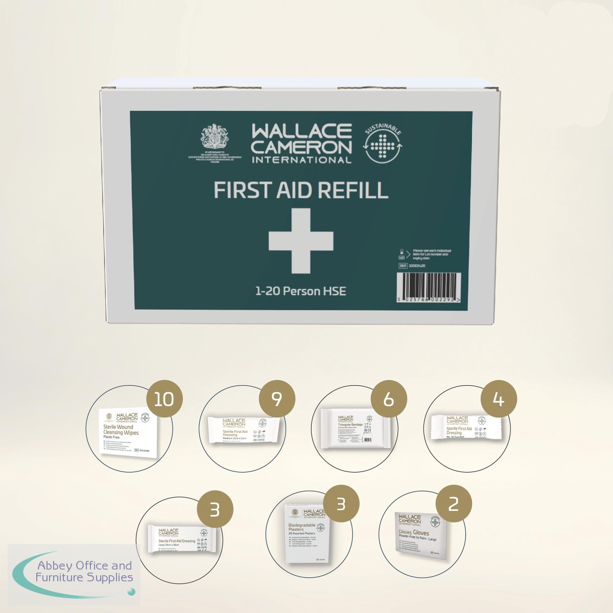 The Wallace Cameron Sustainable HSE Refill allows businesses to top up their first aid kits in line with Health and Safety Executive (HSE) guidelines, without the need to replace the full kit. Helping businesses meet Health and Safety Executive (HSE) standards while actively reducing environmental impact, this refill kit is a practical, compliant solution for workplaces looking to make more responsible choices. Featuring internal packaging of medical-grade paper and recyclable or recycled cardboard and components selected for their lower environmental impact, using viscose, bamboo, and recycled plastic where possible.