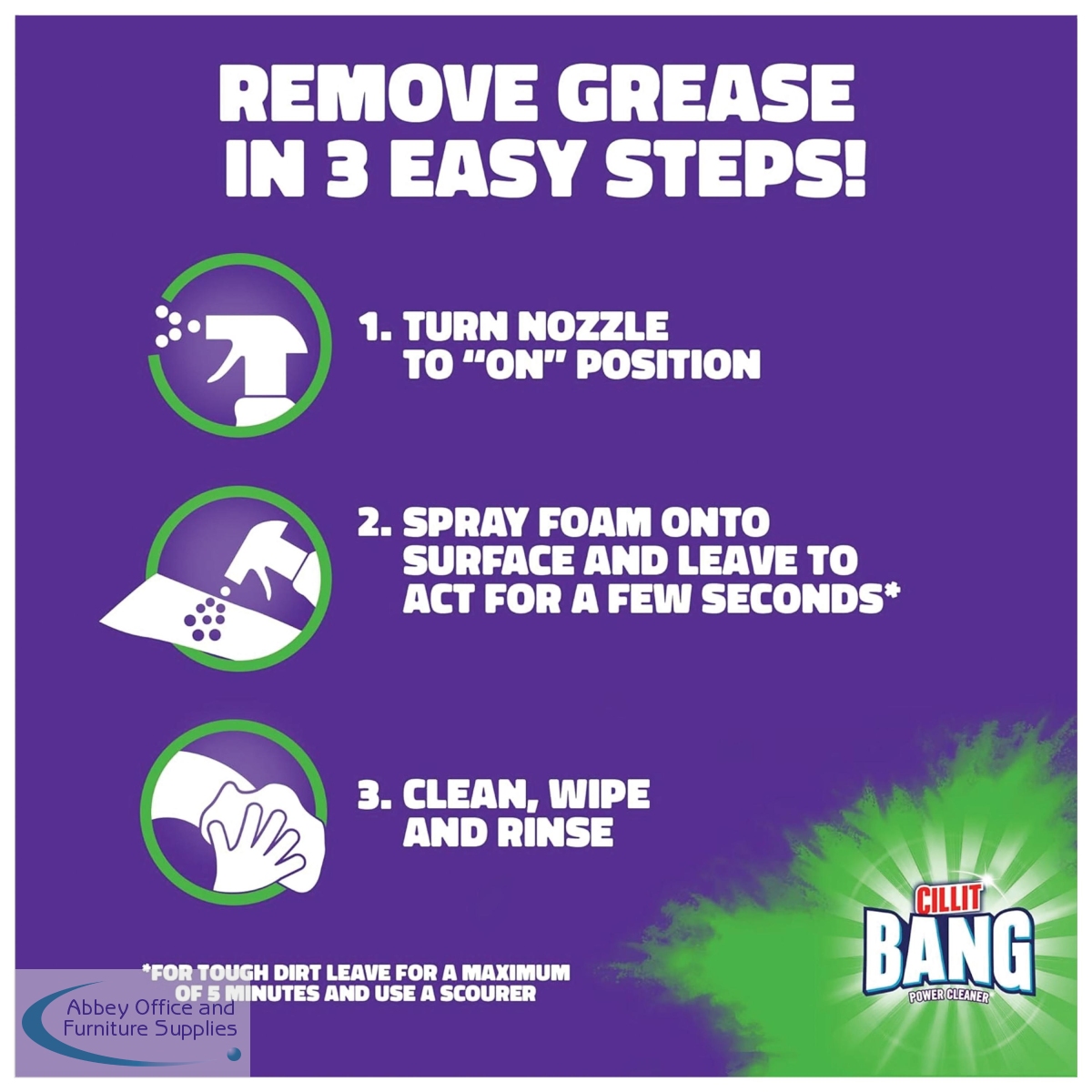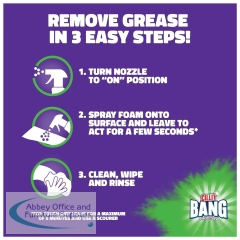 The effective Cillit Bang Burnt-On Degreaser removes up to 100% of grease without scrubbing. This eliminates food stains, burnt-on food residues, grime and grease on multiple surfaces for a sparkling clean home. The power cleaner is also capable of removing 24-hour baked-on grease, whilst tough dirt should be left for a maximum of 5 minutes before using a scourer. Grease can be removed in just three simple steps: turn the nozzle to the on position, spray foam onto surface and leave to act for a few seconds, then clean, wipe and rinse.