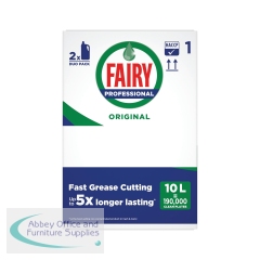 Ideal for professionals, this Fairy Professional Original Washing Up Liquid works wonders for everyday grease challenges. Thanks to its strong cleaning action, it penetrates quickly and effectively, removing most common grease stains found in professional kitchens. Fairy Professional Original gives excellent results, even at cold temperatures (20 Degrees Centigrade), and outstanding cleaning results on up to 95,000 plates with this 5 litre bottle.