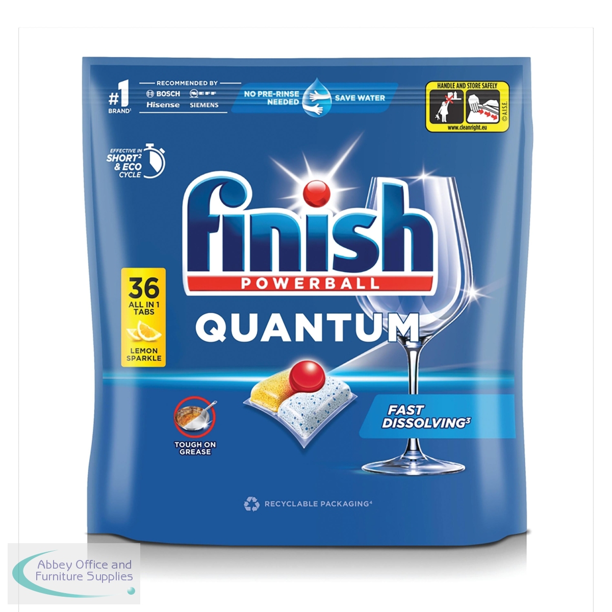Finish Quantum Lemon dishwasher tabs, for a deep clean and sparkling shine first time, every time. No pre-rinsing needed, helping to save water and effective in shorter eco cycles. These fast dissolving dishwasher tabs are supplied in a pack of 36 with a citrus lemon scent.