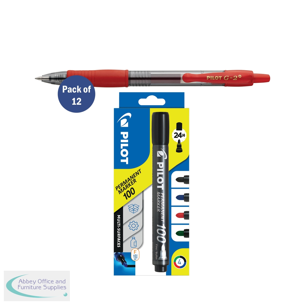 Favoured worldwide by professionals and the public alike, the Pilot G-2 Gel Ink Rollerball Pen contains smooth gel ink which provides a blob-free and vivid writing experience from start to finish with over 997m writing length. The cushioned ergonomic grip and smooth curves of the pocket clip give the pen a simple yet elegant finish that fits in the pocket, pencil case or hand with equal ease. Made from 75% recycled plastic, the pens are CO2 compensated and refillable. This promotion includes a pack of 12 Pilot G-2 gel ink pens in red plus a FREE pack of 4 Pilot 100 markers in assorted colours.