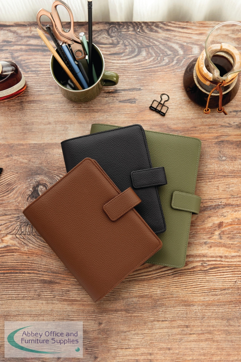 A gender-neutral organiser created with sustainability and lifestyle organisation in mind. Crafted from vegan grain leather made from 100% post-consumer recycled plastic and featuring 100% recycled, fountain pen friendly paper, this collection offers a stylish yet conscious choice. With the innovative feature of charcoal removable rings, the Camden redefines flexibility and functionality, making it easier than ever to customise any planning experience. Supplied in black.
