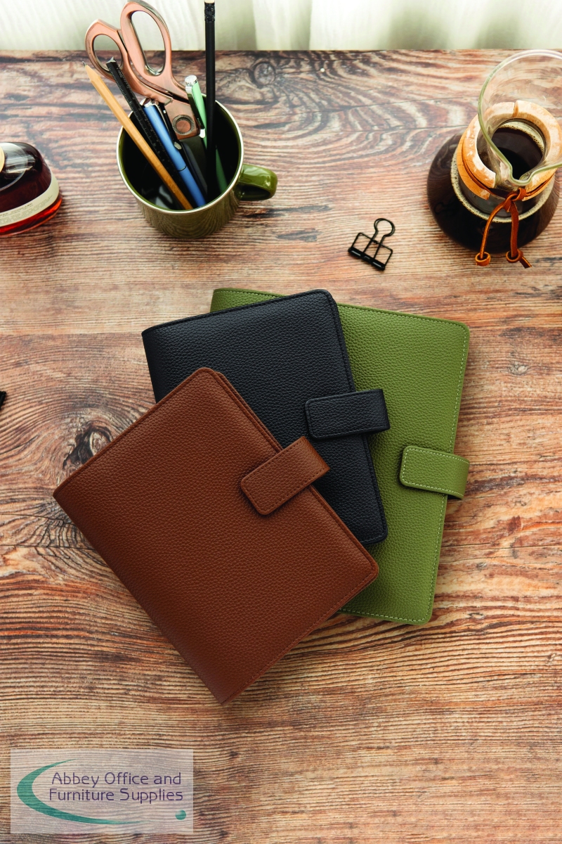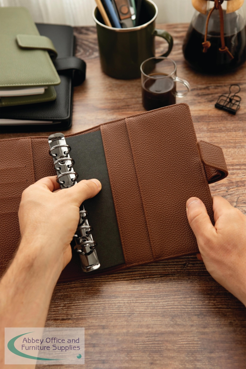 A gender-neutral organiser created with sustainability and lifestyle organisation in mind. Crafted from vegan grain leather made from 100% post-consumer recycled plastic and featuring 100% recycled, fountain pen friendly paper, this collection offers a stylish yet conscious choice. With the innovative feature of charcoal removable rings, the Camden redefines flexibility and functionality, making it easier than ever to customise any planning experience. Supplied in Mocha.