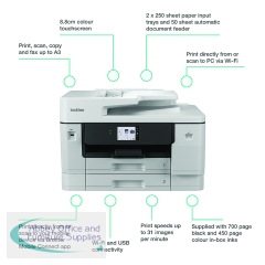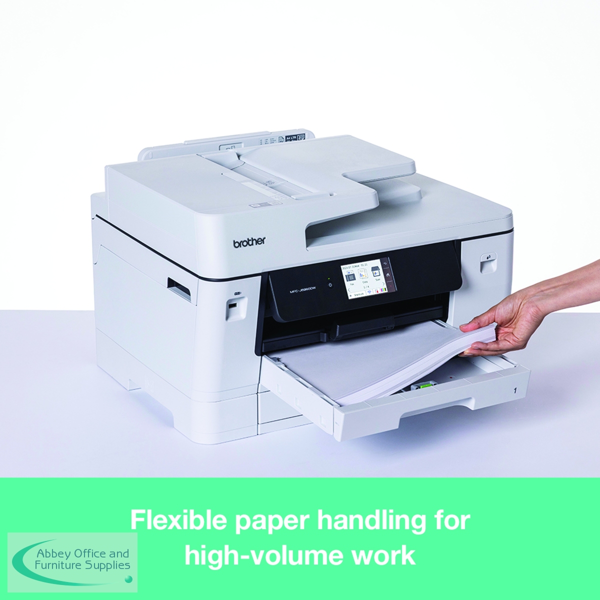 The MFC-J6960DW delivers premium A3 printing, scanning, copying and faxing in one durable inkjet device. Featuring MAXIDRIVE technology, offering fast print speeds and consistently high-quality results. Enjoy flexible paper handling with 2 x 250 sheet paper input trays, 100 sheet multi-purpose tray and 50 sheet automatic document feeder (ADF).