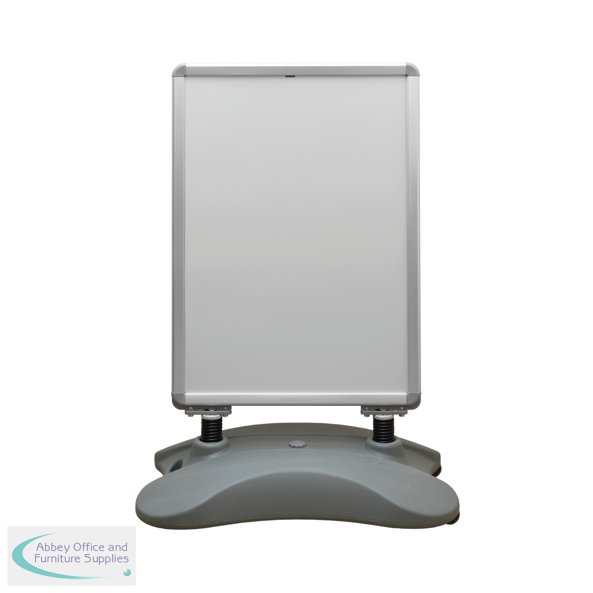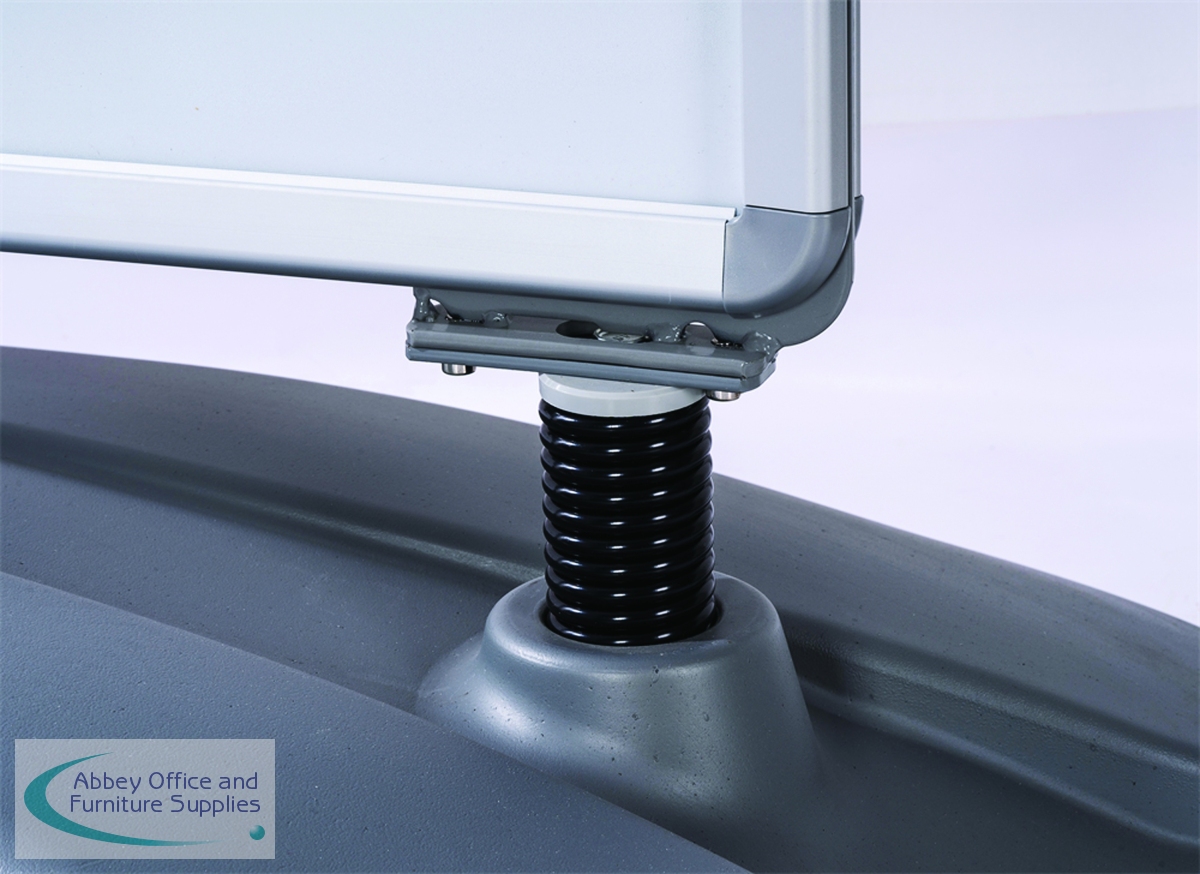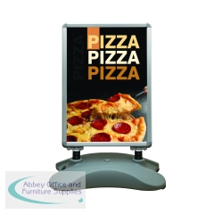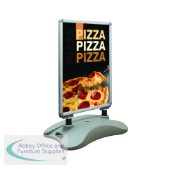 The A1, silver, double-sided, Snap frame is ideal for pavement advertising. Posters (not supplied) can be changed easily by opening up the frame border by hand or using a tool supplied. The 32mm frame profile gives sturdiness featuring grey plastic rounded corners. Complete with integrated wheels which allow the display board to be easily wheeled into the desired position. The assembled dimensions measure W800 x D510 x H1130mm with an unfilled weight of 12kg. Representing great value to business owners, who are looking for the most effective way to communicate and advertise to potential customers, the announce frame comes complete with a heavy duty plastic base which can be filled with water via the filler cap to provide extra weight and two strong springs that give the stand stability in strong winds.