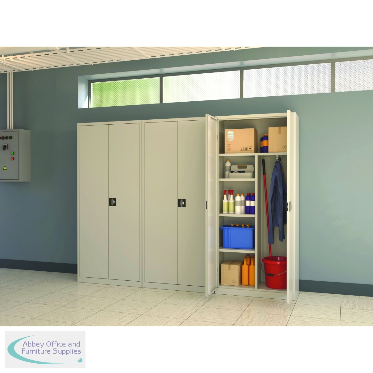 The 5 Star Steel Janitorial Cleaning Cupboard is designed for safe and organised storage of cleaning products. This cupboard has three compartments consisting of a tall upper section and two wardrobe style sections, one of which is equipped with an internal hanging rail. With open space beneath the compartments that provides convenient storage, there are also three adjustable shelves with a shelf load capacity of 40kg. A cylinder lock is included as well as two keys. The cupboard is manufactured from durable 0.6mm cold-rolled steel and is also supplied assembled.