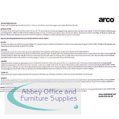 This Arco spill kit provides a response to chemical spillages and contains polypropylene absorbents which can absorb up to 25 times their own weight in liquid. The kit is supplied in a clip-top carrier for easy handling and is quick and easy to deploy, removing the slip hazard on a floor effectively and with no dust or mess to clean up afterwards. Chemical absorbents can be used on a wide range of products including most acids, alkalis, oil and water-based liquids.