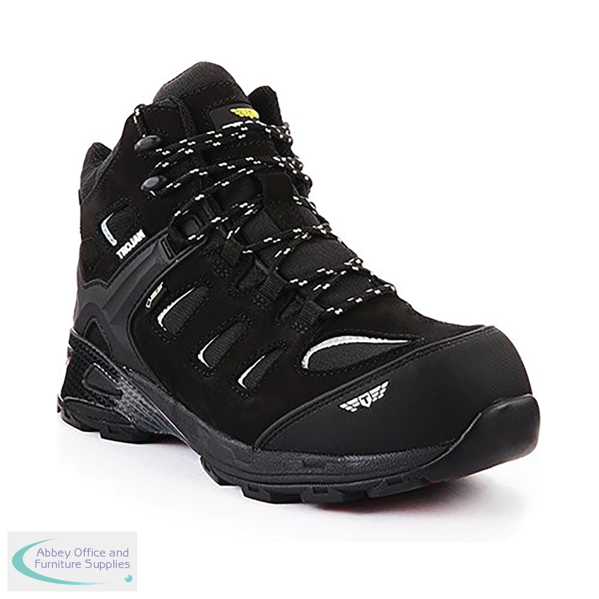 Manufactured with a high-performance Gore-Tex material, these Trojan Thaumas safety hiker boots feature a waterproof and breathable bootie liner which keeps the rain out but allows your feet to breathe, providing great Comfort when you're working hard. The composite toecaps and midsoles guard against the common hazards of the workplace and are ideal for metal-free environments. With their hiker style, these safety boots are stylish, Comfortable and ideal for the modern workplace.