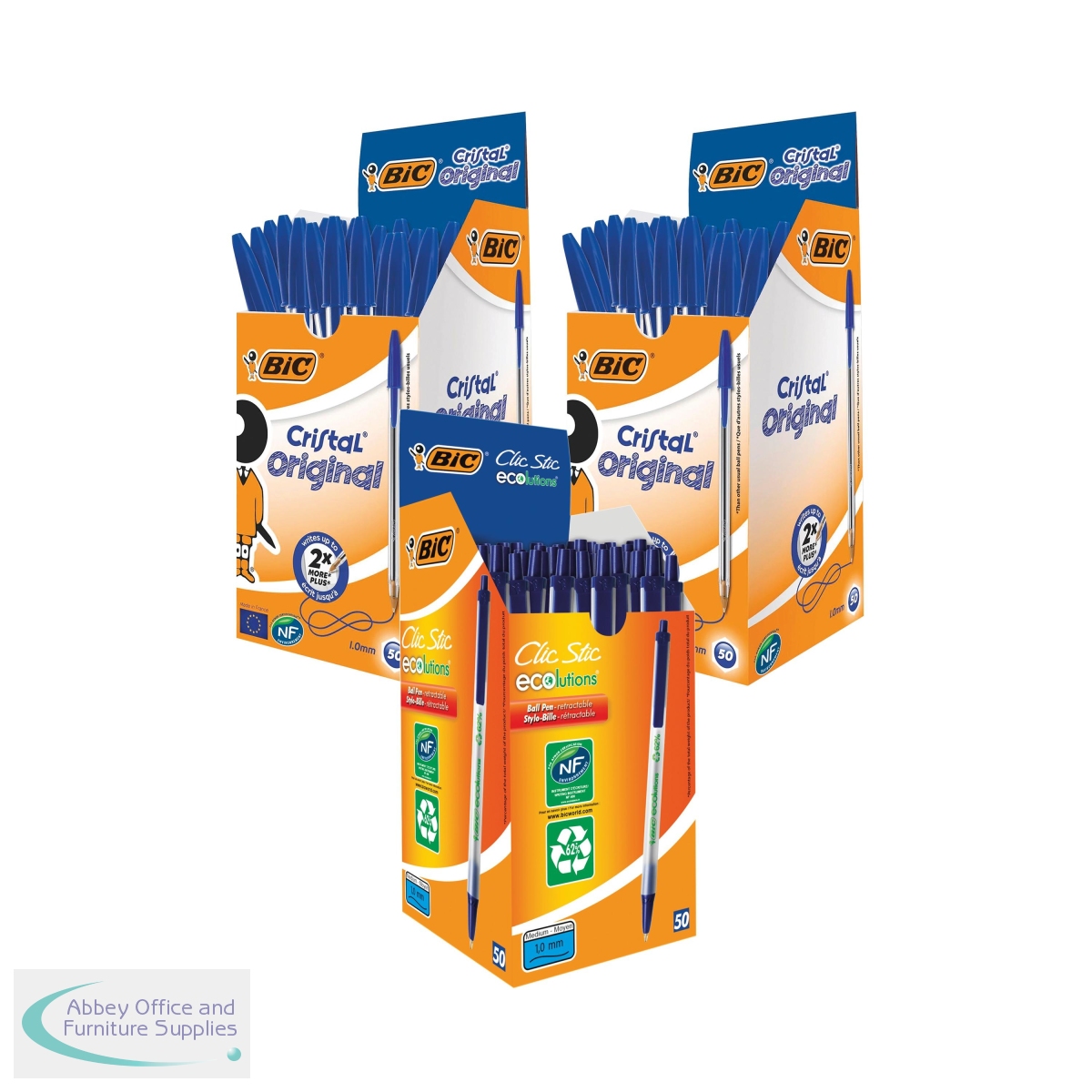 These Bic Cristal Ballpoint Pens feature a durable tungsten carbide ball mechanism and smooth oil-based ink for reliable, everyday use. The medium 1.0mm tip produces a thin 0.4mm line for elegant handwriting and detailed sketching. The hexagonal barrel includes a blue cap and end plug that matches the ink colour for easy identification. This pack contains 2 packs of 50 blue pens plus a FREE pack of 50 Bic Clic Stick blue pens.