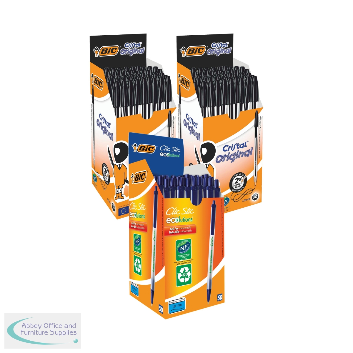 These Bic Cristal Ballpoint Pens feature a durable tungsten carbide ball mechanism and smooth oil-based ink for reliable, everyday use. The medium 1.0mm tip produces a thin 0.4mm line for elegant handwriting and detailed sketching. The hexagonal barrel includes a blue cap and end plug that matches the ink colour for easy identification. This pack contains 2 packs of 50 black pens plus a FREE pack of 50 Bic Clic Stick black pens.