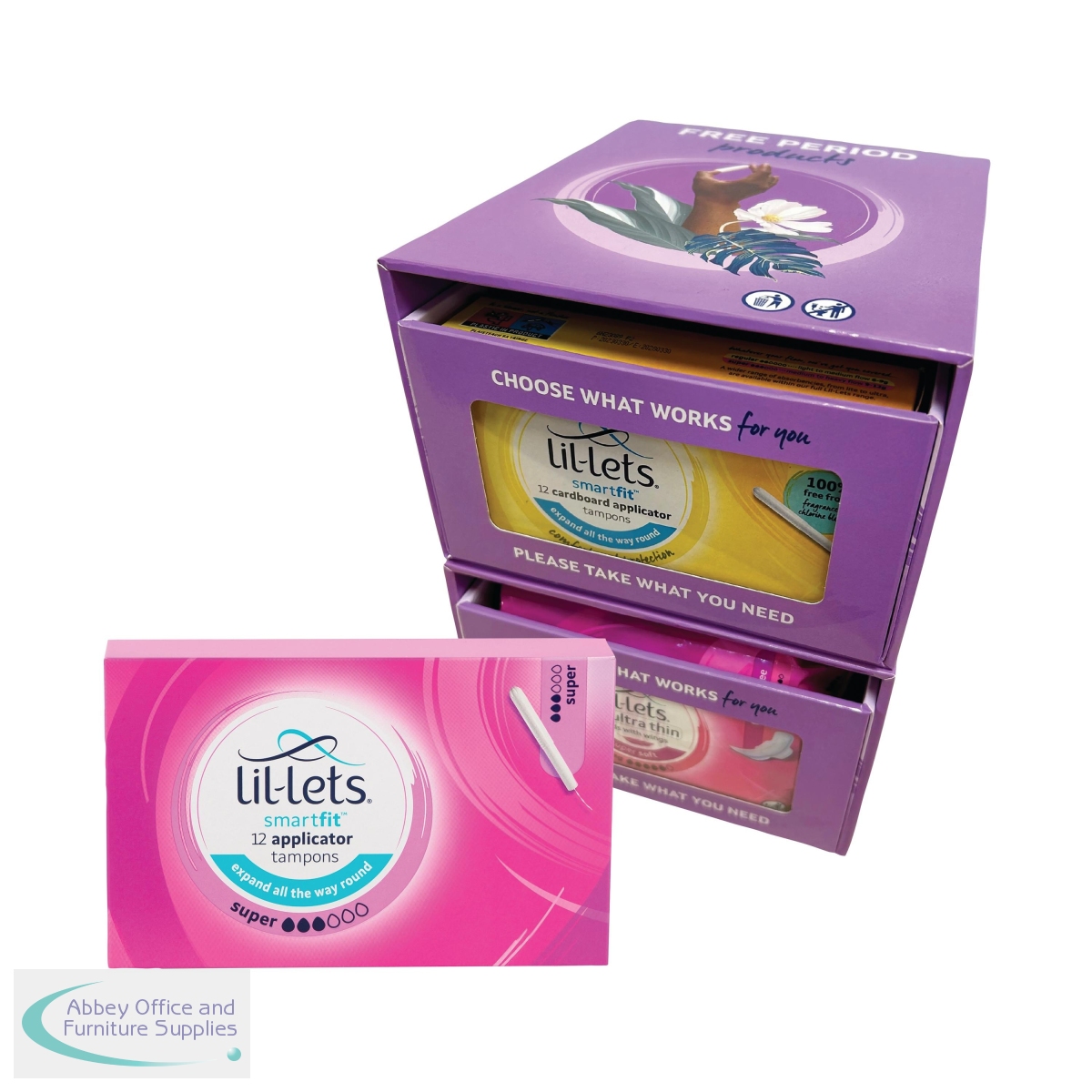 Lil-Lets applicator tampons in super, for heavy flow. The cardboard applicator has an anti-slip grip, the Smartfit design provides a tampon that expands all the way for amazing comfort. The rounded tip aids easy insertion. Perfect protection against leaks for up to 8 hours. This promotion includes 24 packs of tampons (288 tampons in total) plus a FREE Period Care Dispenser.