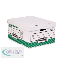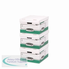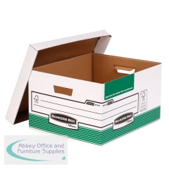 This Bankers Box storage box features time saving Fastfold assembly, with a double layer of board on the end panels and base for additional strength. The box can hold 3 x Bankers Box 120mm foolscap transfer files and is ideal for long term and archive storage. This pack contains 10 green and white storage boxes measuring W370 x D440 x H255mm (internal).