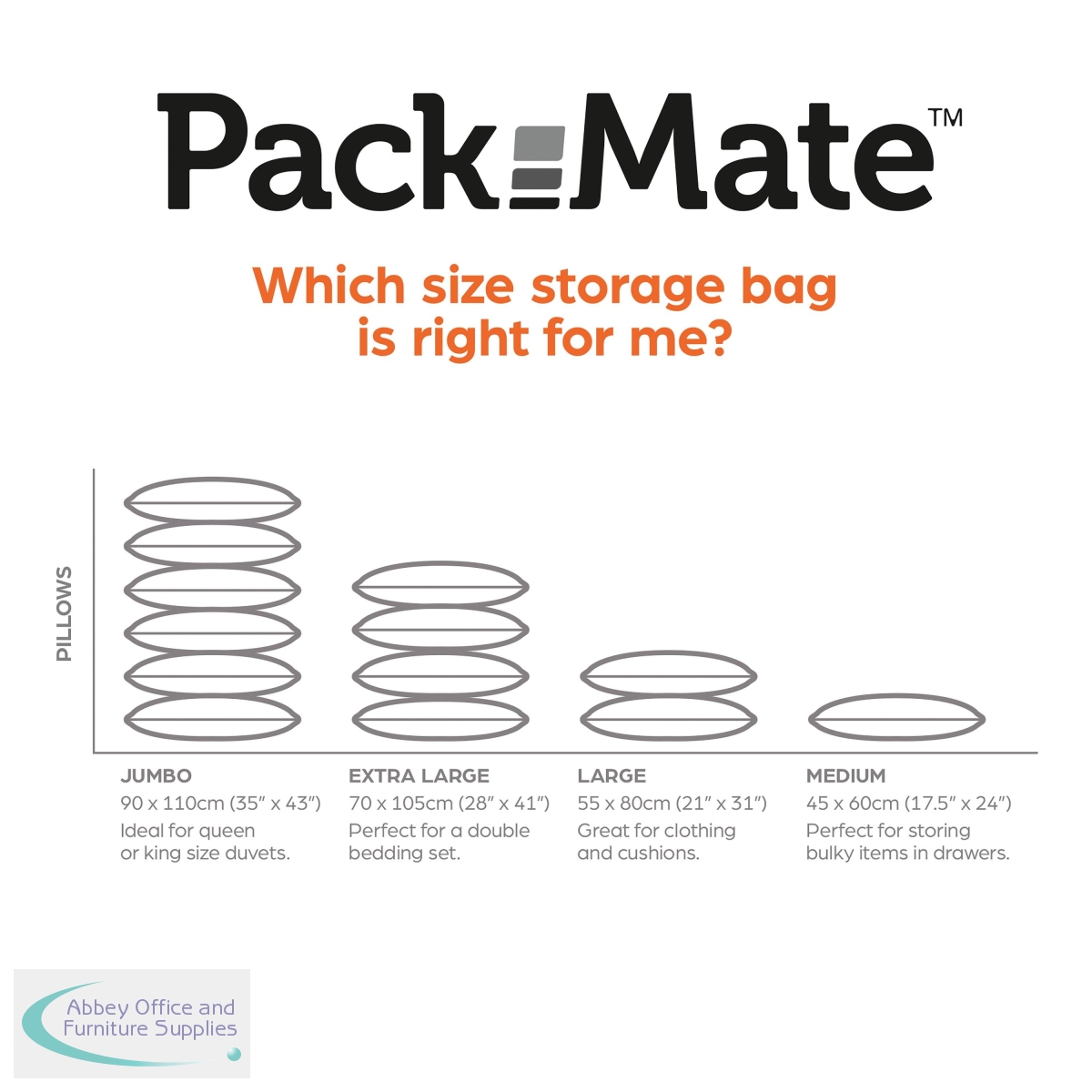 Packmate Flat vacuum storage bags compress flat and are ideal for storing under a bed or in drawers, as well as the usual attic, garage or cellar space. Packmate space saving bags also protect the contents from dirt, dust, damp and bugs. The 'Pillow Graph' helps guide purchasers to choose the correct size, based on the average sized hollow fibre pillow. Providing on average, 4 times more space using these space saving bags which are designed to work with most vacuums with a hose. Made from a multi-layer laminated blend which includes Nylon to help prevent rips, punctures and tears, they provide years of use and can be fully recycled. Supplied in a pack of 2.