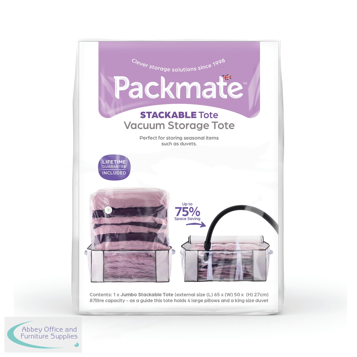 Packmate's Storage Totes are the ideal solution to easy, bulk, stackable storage. A large square, zipped canvas base, inside which one of Packmate's vacuum bags can be unfolded and filled. When vacuuming down bags, the items inside will reduce inside the canvas tote, taking shape which can then be zipped up into the tote for easy storage and stackable boxes. Ideal for short-term or long-term storage, as well as in the usual attic, garage or cellar space. These space-saving bags protect contents from dirt, dust, dampness, bugs and so much more. Providing on average, 4 times more space, they will also protect the contents from dirt, dust, damp and bugs. Made from a multi-layer laminated blend that includes nylon to help prevent rips, punctures and tears, they provide years of use and can be fully recycled.