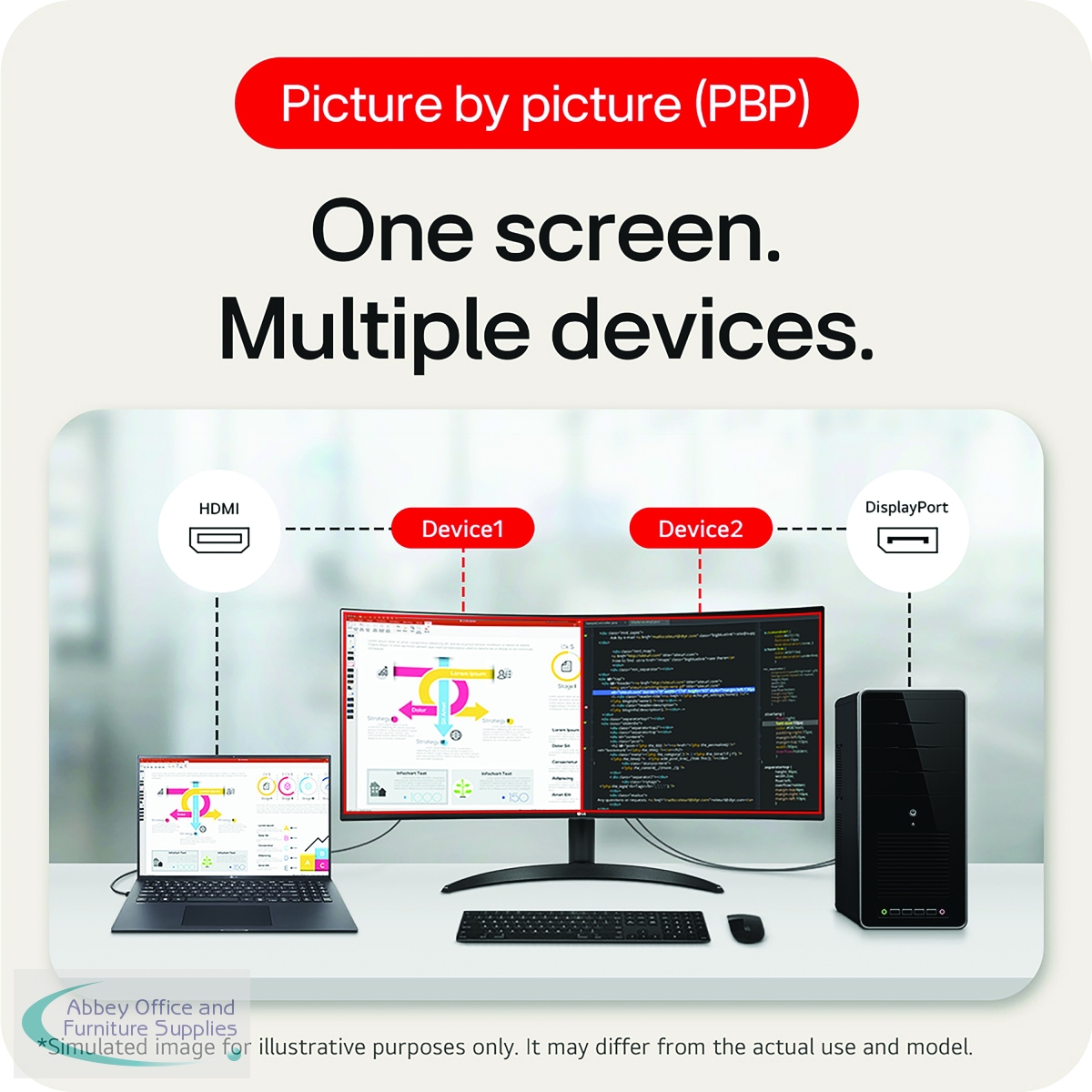 The UltraWide QHD (3440x1440) with 1800R curvature and 21:9 aspect ratio is great for work as it can display various programs at once. It allows you to see multiple contents from two computers with the picture-by-picture feature, so it helps to process work efficiently. The LG Switch app helps to optimize the monitor to your work and life. You can readily divide the whole display up to 6, change the theme design, or even launch a video call platform with a mapped hotkey.