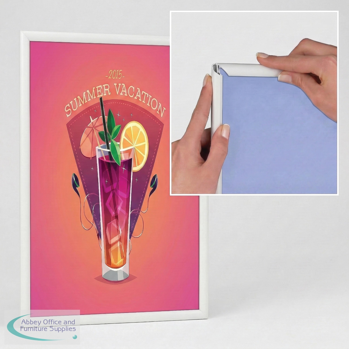 A very neat narrow 15mm profile snap frame for smaller sizes. It is so easy to clip open the aluminium frame to access your poster or graphic image which is protected by an anti-glare plastic cover sheet. Available in white powdercoat finish.