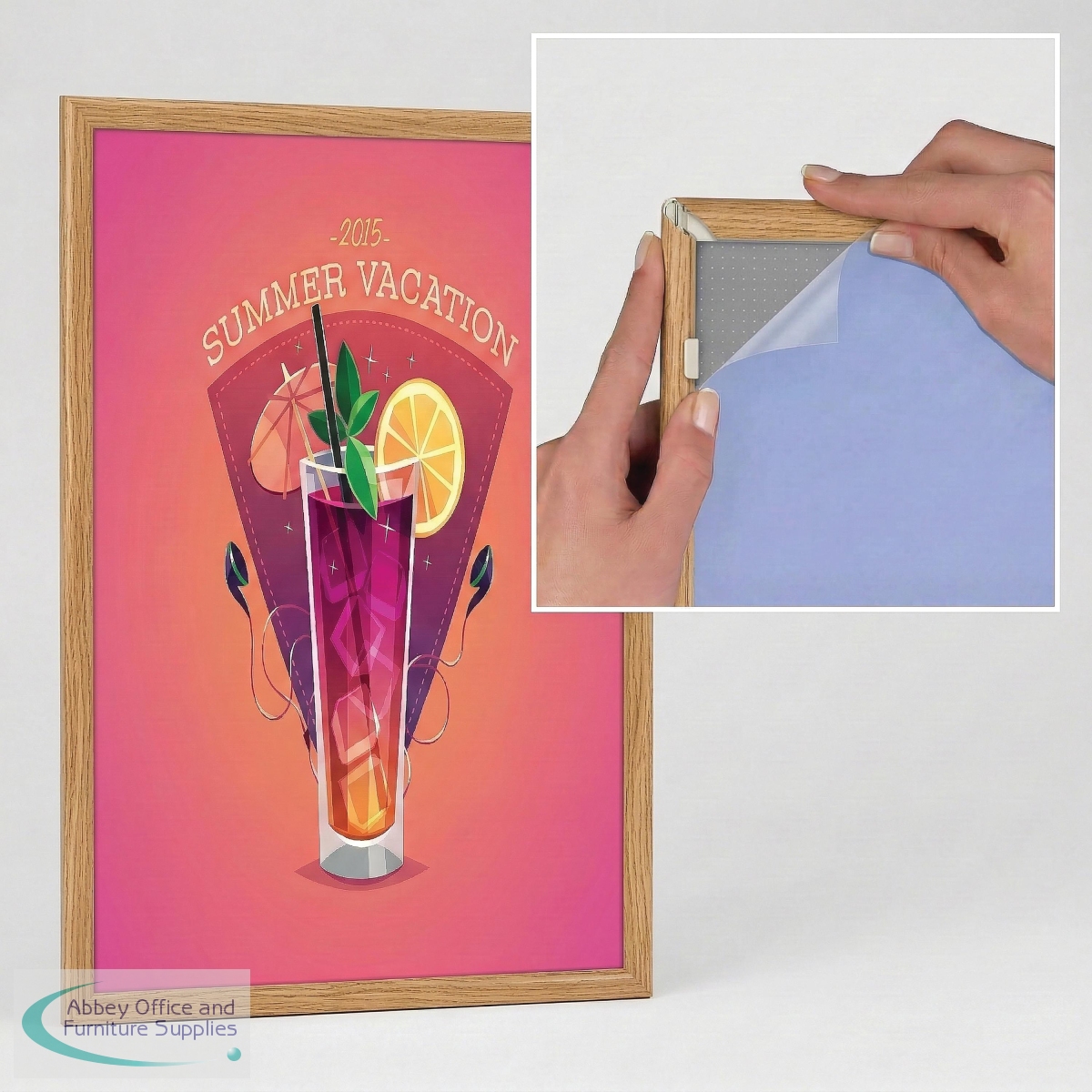 A very neat narrow 15mm profile snap frame for smaller sizes. It is so easy to clip open the aluminium frame to access your poster or graphic image which is protected by an anti-glare plastic cover sheet. Available in oak wood effect finish.