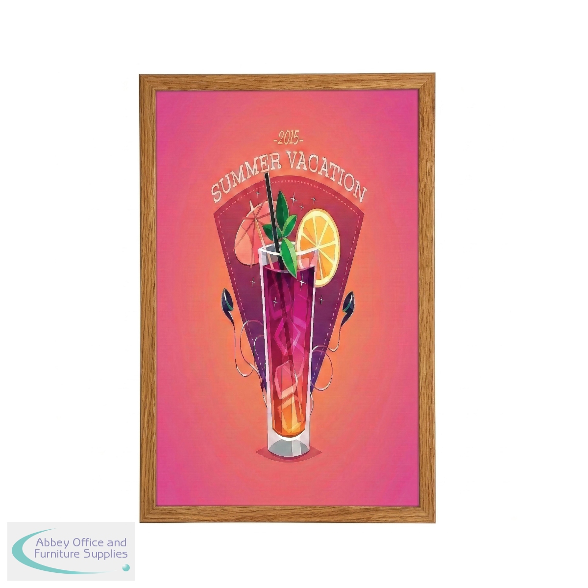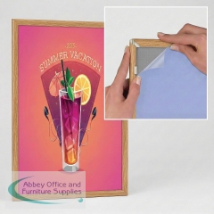 A very neat narrow 15mm profile snap frame for smaller sizes. It is so easy to clip open the aluminium frame to access your poster or graphic image which is protected by an anti-glare plastic cover sheet. Available in oak wood effect finish.