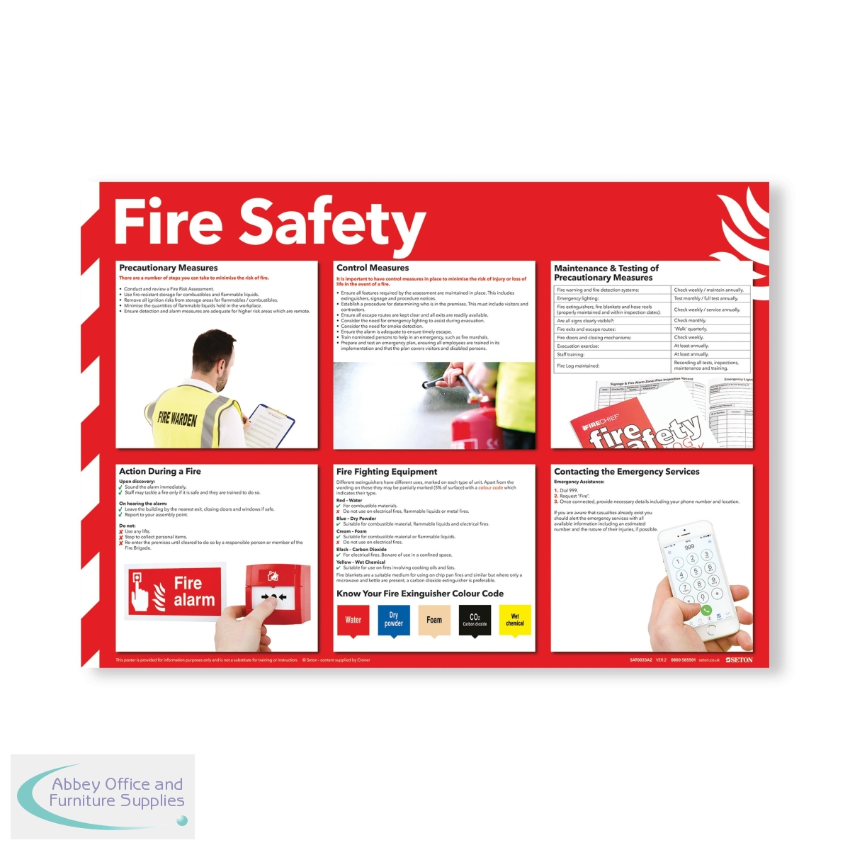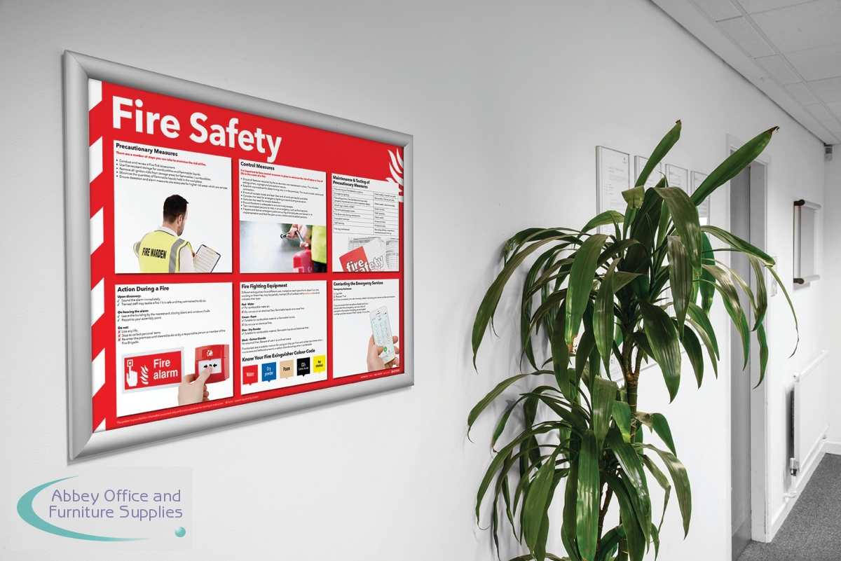 The Fire Safety sign is a standard workplace safety sign designed for high visibility. Displaying the six steps to take: Minimise the potential, Minimise dangers to staff, Maintenance of fire precautions, Fire actions, Fire extinguishers, and Contacting the emergency services. This A2 poster provides clear guidelines for fire safety in the workplace.