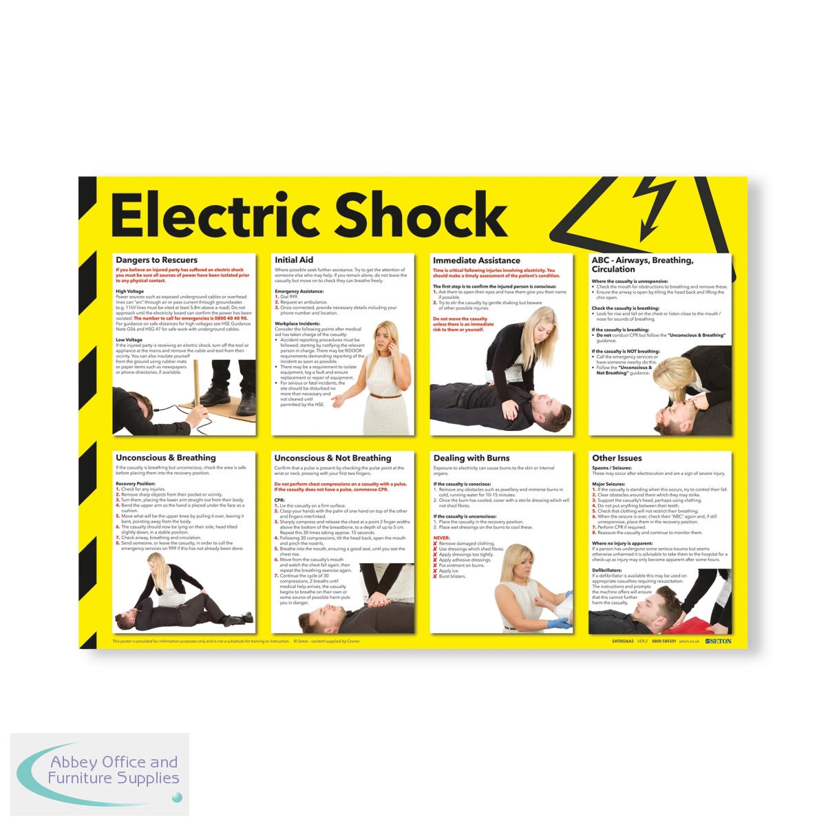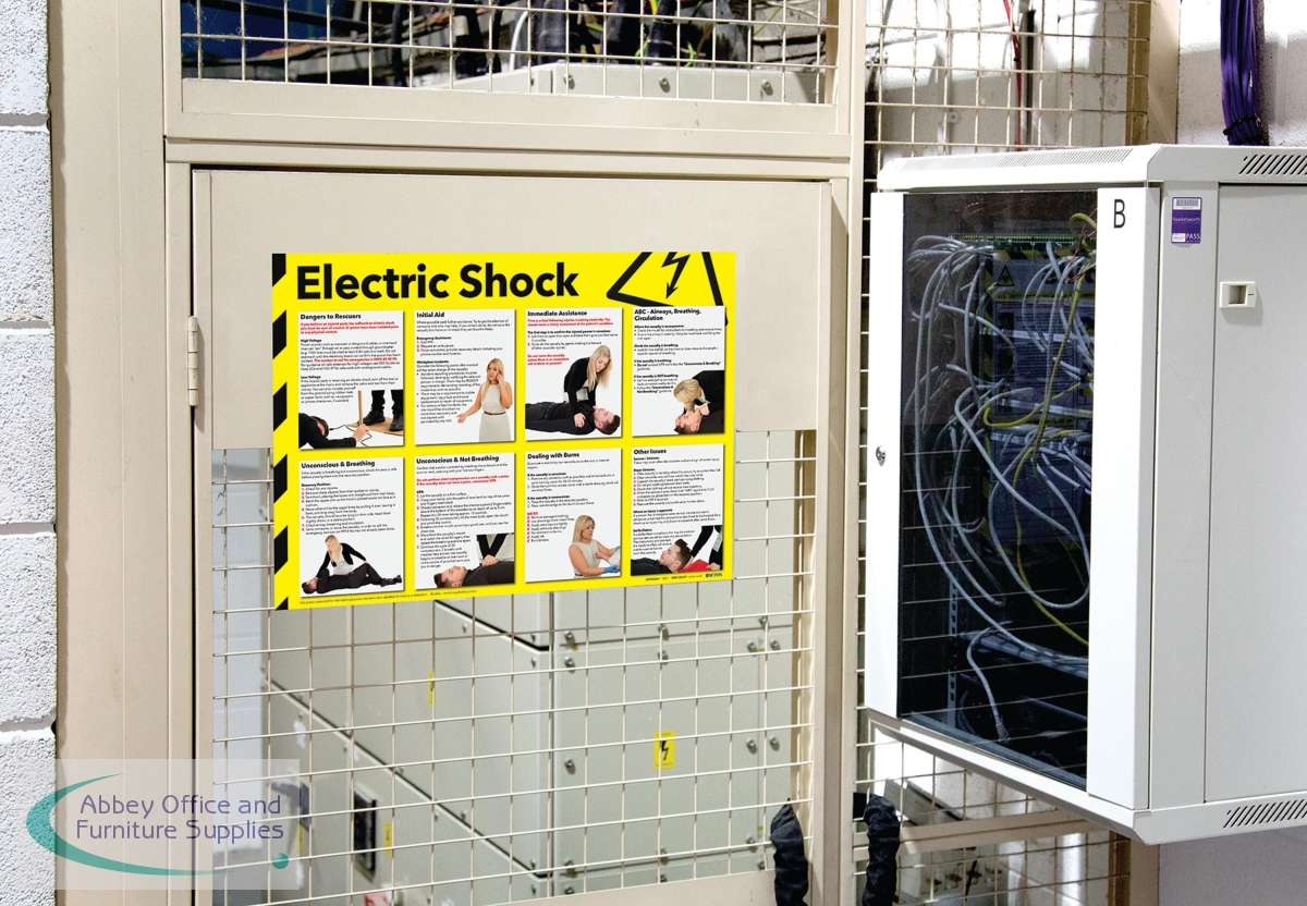 The electric shock sign is an essential workplace safety tool designed to warn of hazards and provide immediate first aid guidance. Laminated for durability, the sign complies with UK health and safety standards. Covering the 6 stages of treatment: Danger, Response, Airway, Unconsciousness, Other Injuries, and Getting Help, the sign provides clinically sound instructions for emergency responses.