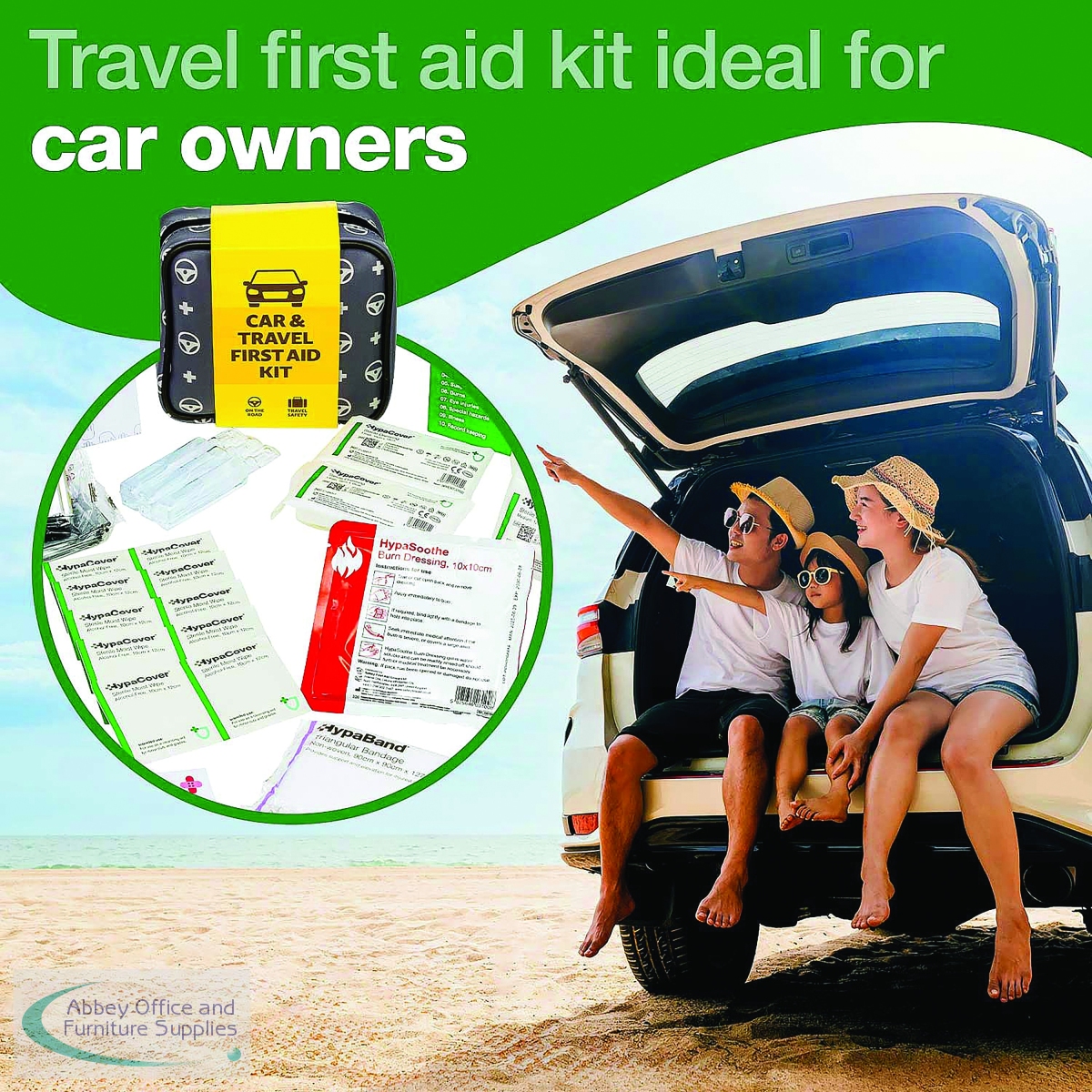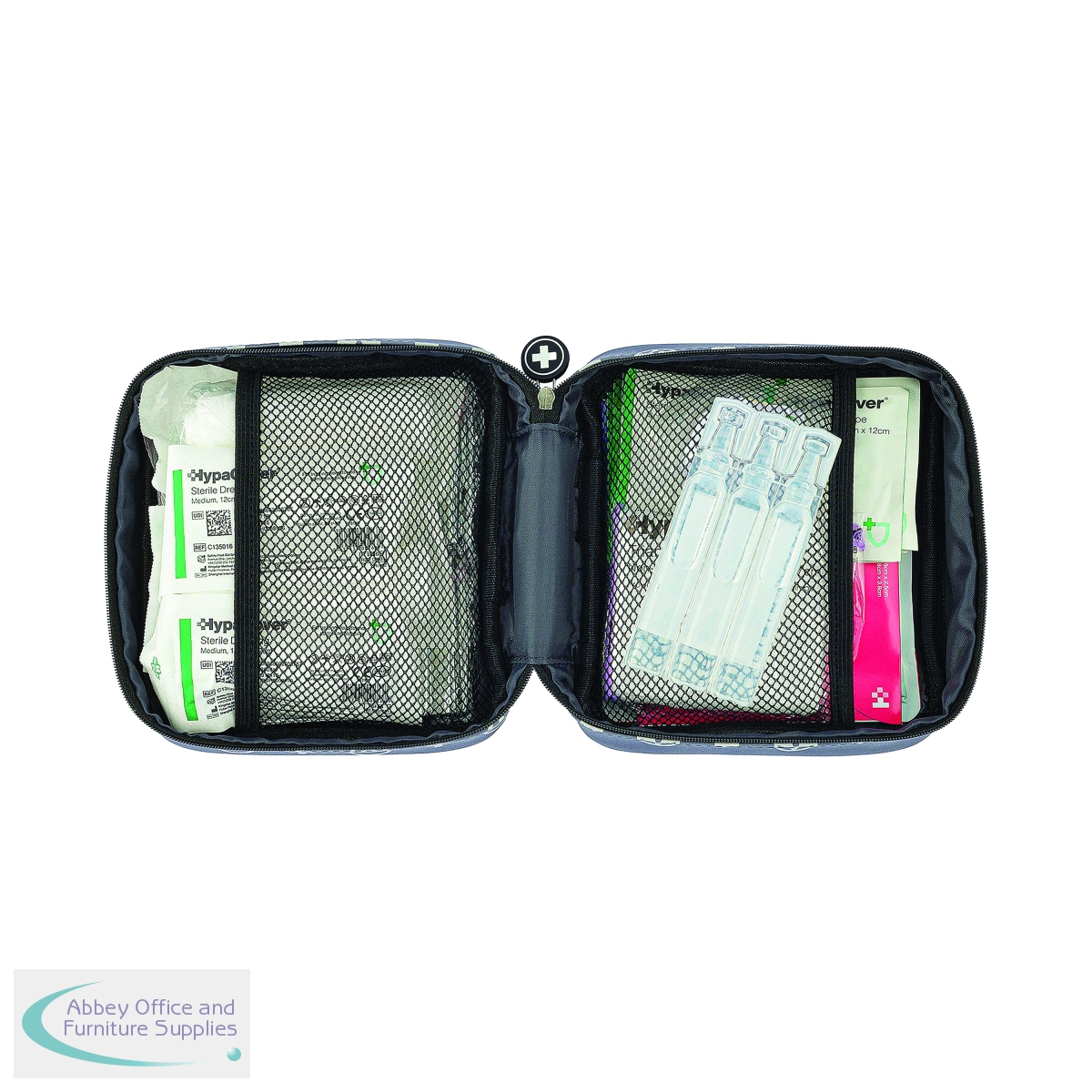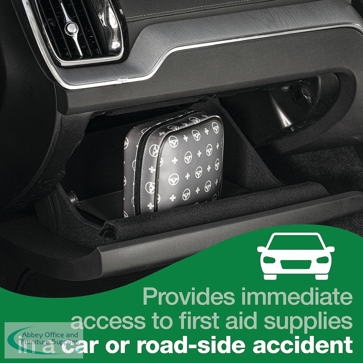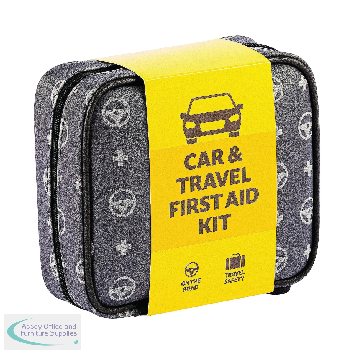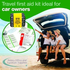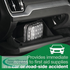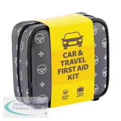 Safety First Aid Group's Car and Travel First Aid Kit is the ideal first aid kit for cars, providing immediate access to essential first aid supplies in emergency situations. Included in the first aid kit are sterile moist wipes, sterile dressings, microporous tape, burn dressing, a foil blanket, gloves, eyewash solution and more. This vehicle first aid kit comes in a reusable, zippered case designed to keep medical supplies neatly organised and well-protected. Inside, two secure mesh pockets help prevent items from shifting, making everything easy to find in an emergency. The case features a dark grey, water-resistant exterior with light grey decals of a first aid cross and a steering wheel, ensuring it's instantly recognisable as a motoring first aid kit. Built from tough, easy-to-clean materials, the case is designed to withstand the rough-and-tumble environment of your glove compartment, boot, or toolbox. A removable cardboard sleeve wraps the kit and includes a detailed list of contents on the back so that users know exactly what's included when every second counts.