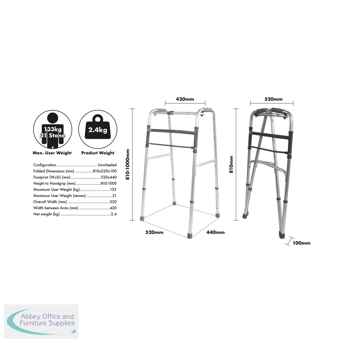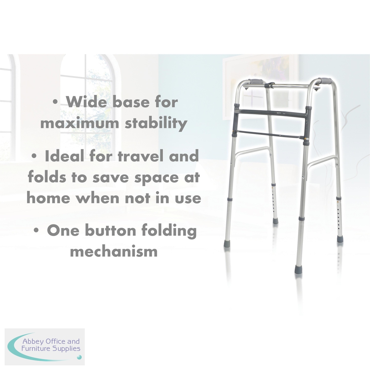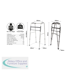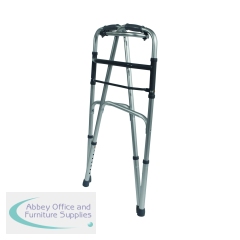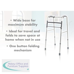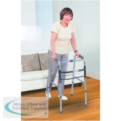 Lightweight Aluminium Folding Walking Frame with a wide base for maximum stability, ideal for home use. The lightweight aluminium walking frame features soft grip handles, one button folding function and height adjustable legs. This frame can be folded when not in use and is a real space saver. Ideal for travel use. Maximum User Weight Limit 133kg (21 stone). Supplied without wheels.