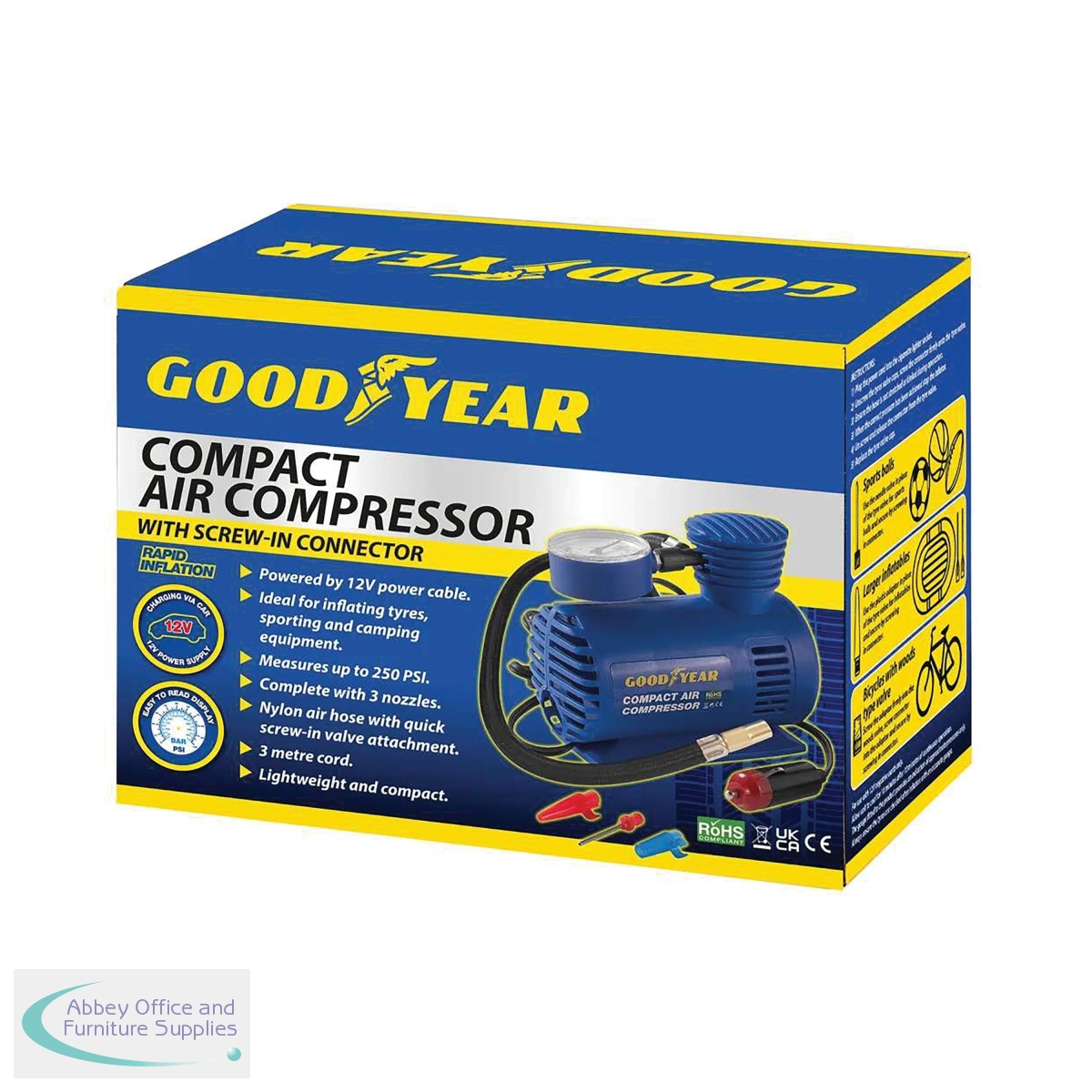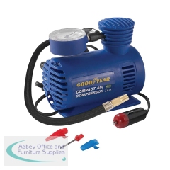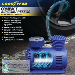 The Goodyear Compact Air Compressor is ideal for the rapid inflation of tyres, sporting and camping equipment. Complete with three nozzles, this lightweight and compact design has a secure valve attachment with a nylon air hose with quick release chuck. Powered by a 12V power cable and measuring up to 250 PSI, the air compressor has a three metre cord.