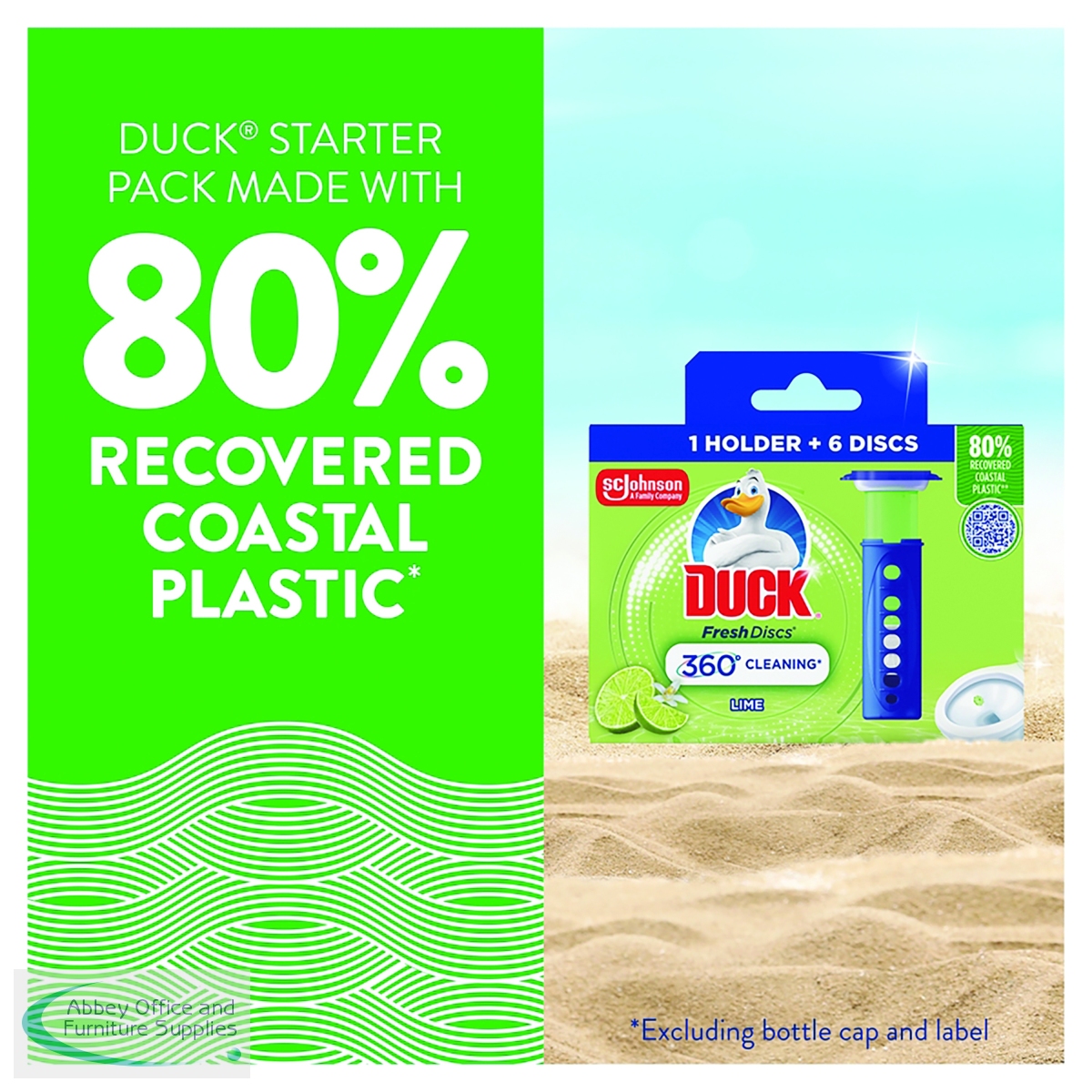 Toilet Duck makes your toilet bright, white and dirt-free. Each pack contains one handle, one tube and six toilet disc stamps. The unique gel technology helps fight stains that harbor germs, while preventing limescale buildup. Duck Fresh Discs climb the bowl for 360 degree coverage and freshen with every flush for a continuous 24/7 fragrance. The lime scent is fresh and crisp, and there's no touching the toilet or cage with your hands. The gel-stick plastic tube stamps the disc on the toilet bowl with just a simple push. Fresh Discs keep on working, flush after flush. Once a disc is attached it freshens with each flush. Every time you walk into the bathroom, you will be greeted with a fresh lime scent. Duck Fresh Discs are suitable for septic tanks, while also preventing limescale buildup. Duck Fresh Discs blister is made from 50% plastic collected on land to prevent it from reaching the ocean, collected in partnership with Plastic Bank.