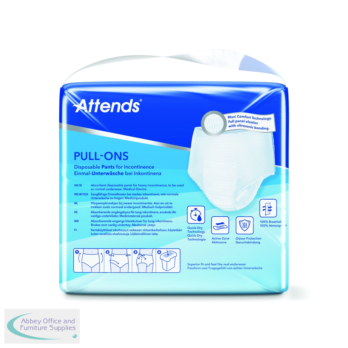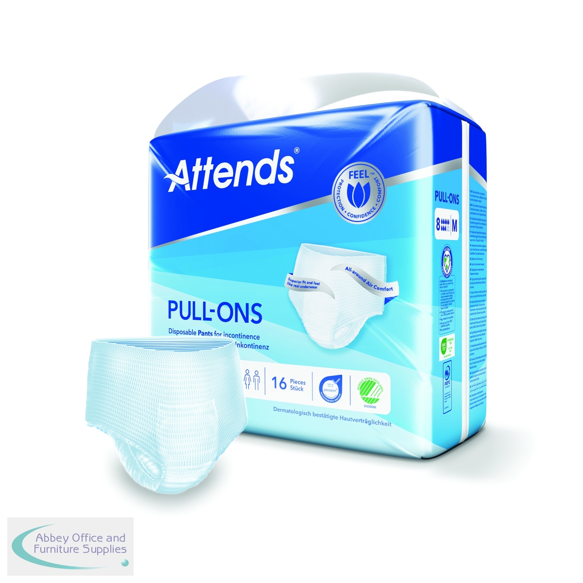 These size Medium Attends Pull-Ons are absorbent, disposable incontinence pants designed for heavy urinary and/or faecal incontinence. They are unisex and designed to fit like regular underwear, featuring a flexible shape and breathable material to maintain skin health. This pack contains 4 packs of 16 pants (64 pants in total).